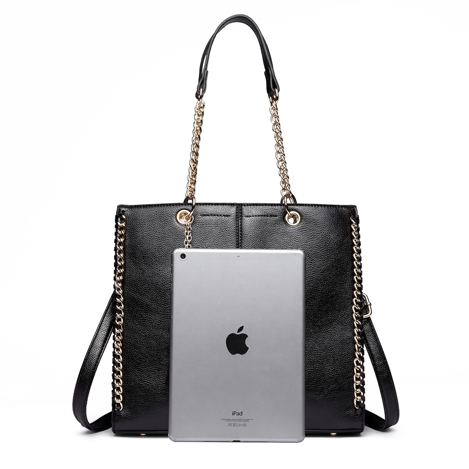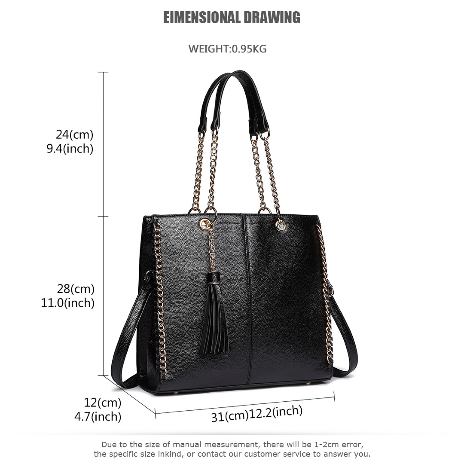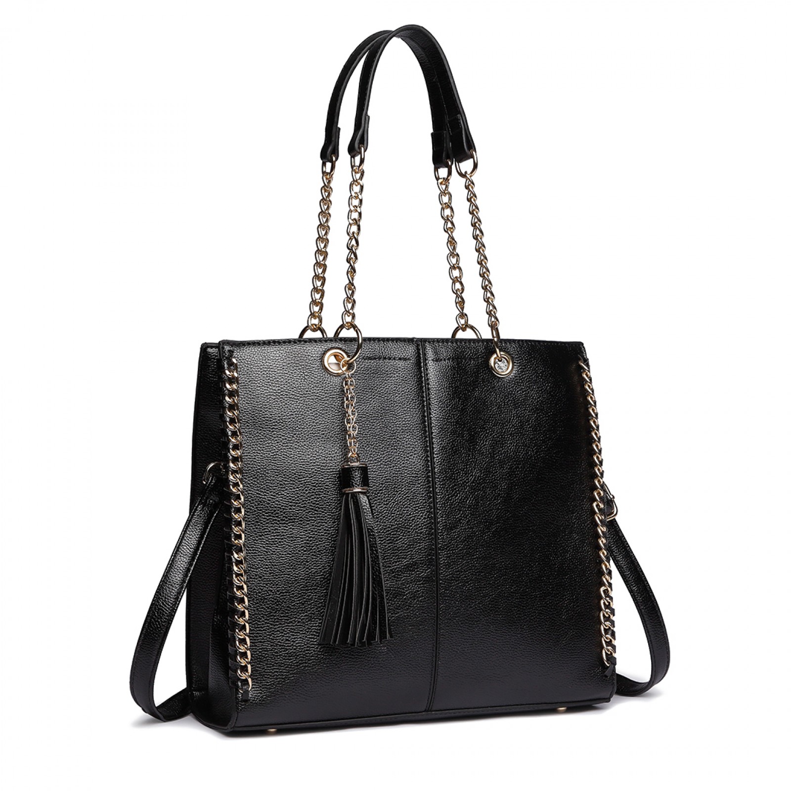 LT1821 BK -Miss Lulu Faux Leather Tassel Chain Tote Handbags Black
