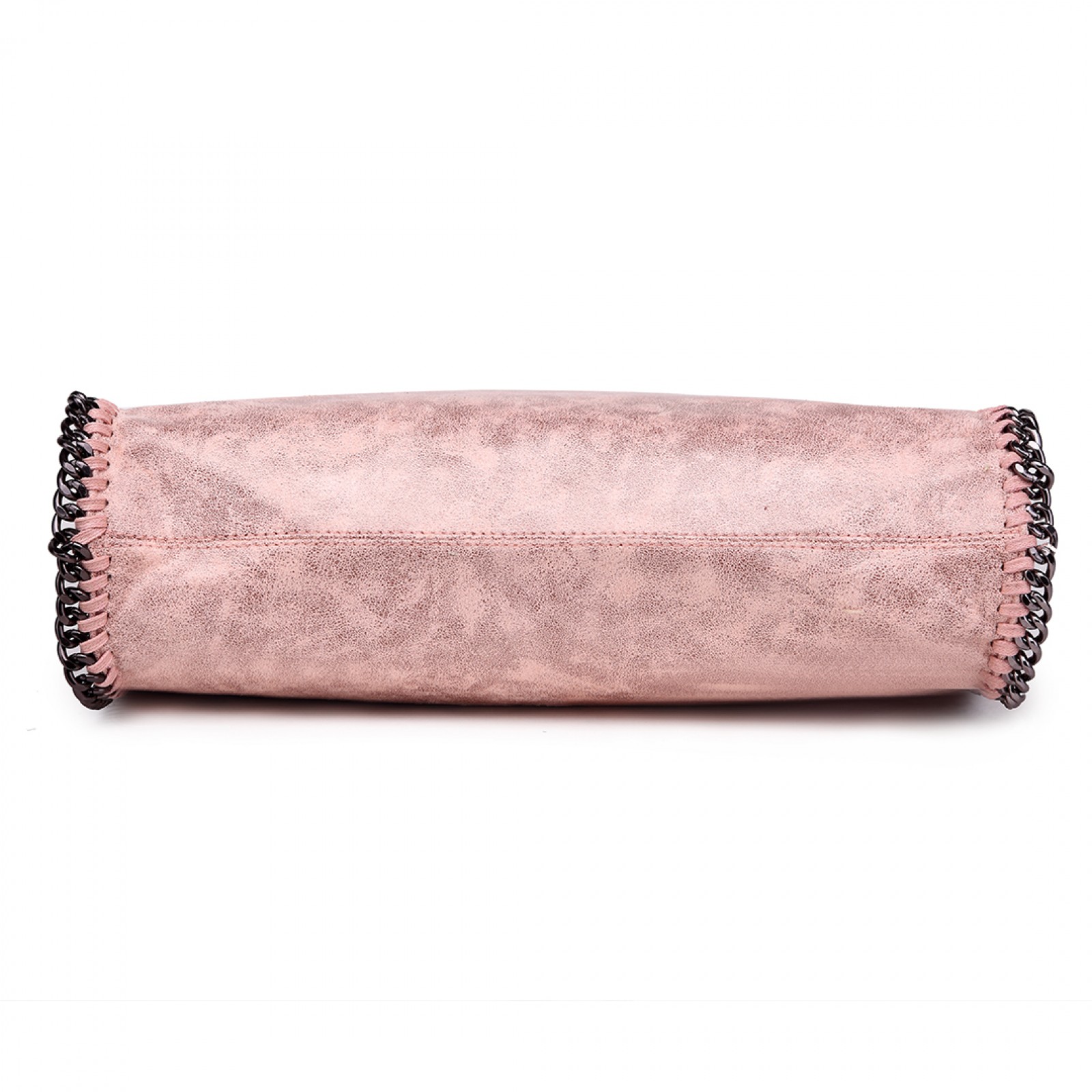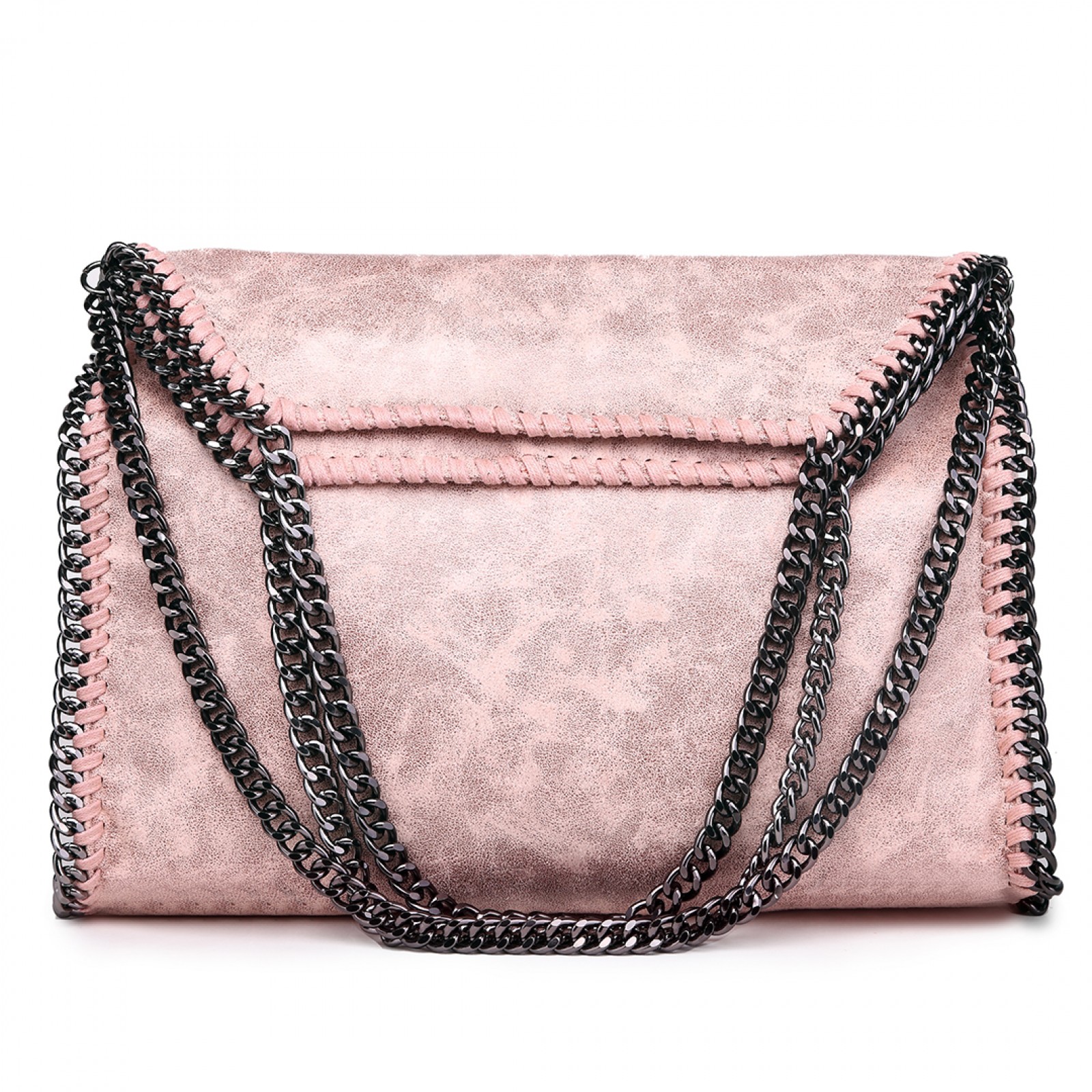 Gunmetal chain woven into the border of the bag, turning into the handles at the top of the bag