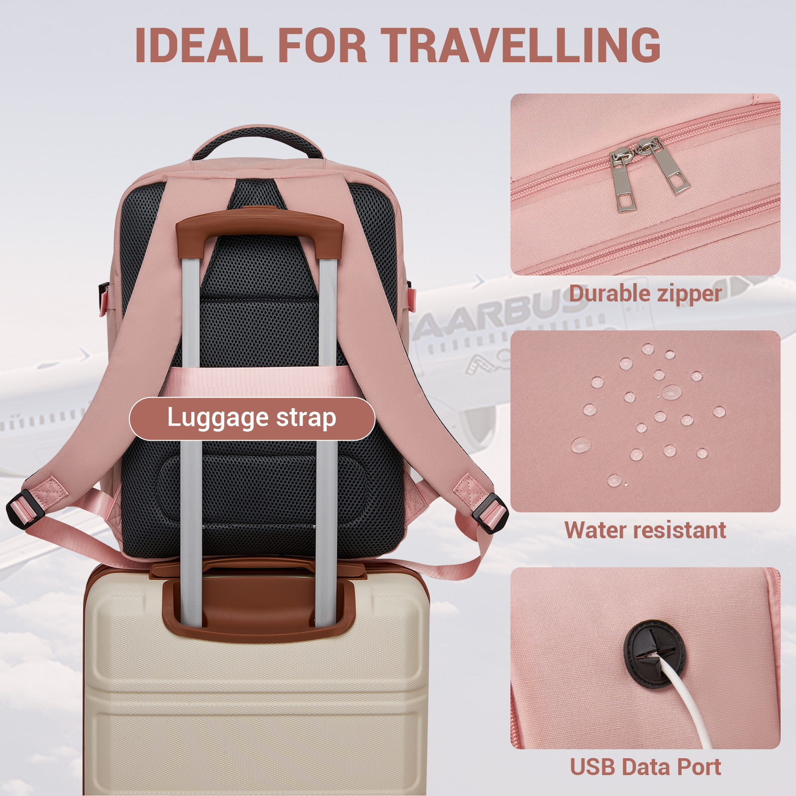 BPK2524 - Kono Spacious and Organised Personal-Item Backpack (40×30×20) with 15.6" Laptop Sleeve, Clamshell Main - Pink