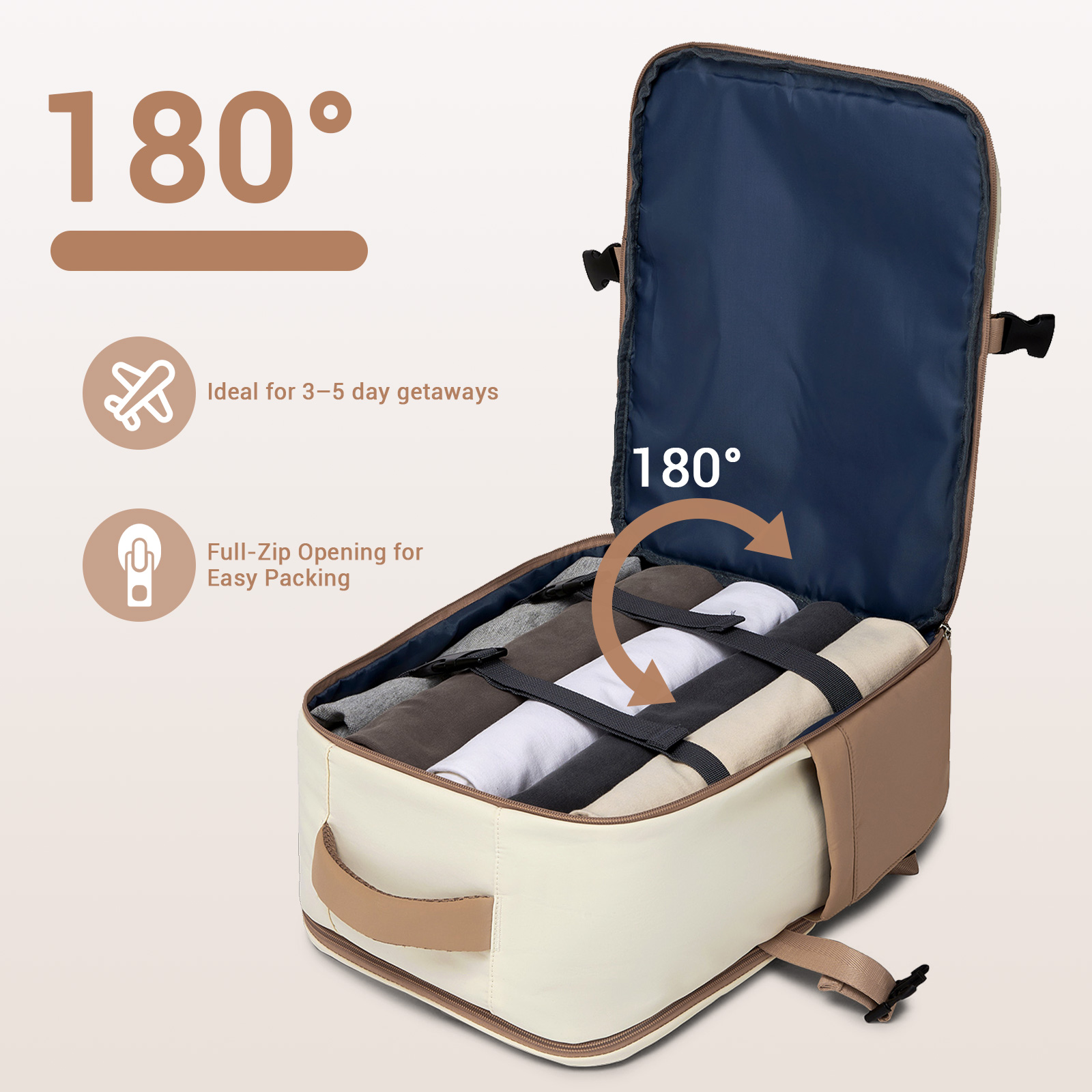 This travel backpack boasts three main zippered compartments. The front compartment includes a zippered pocket, two slip pockets, and two pen holders, making it perfect for organizing your accessories. The middle compartment unfolds like a suitcase, complete with adjustable straps to neatly store your clothing.