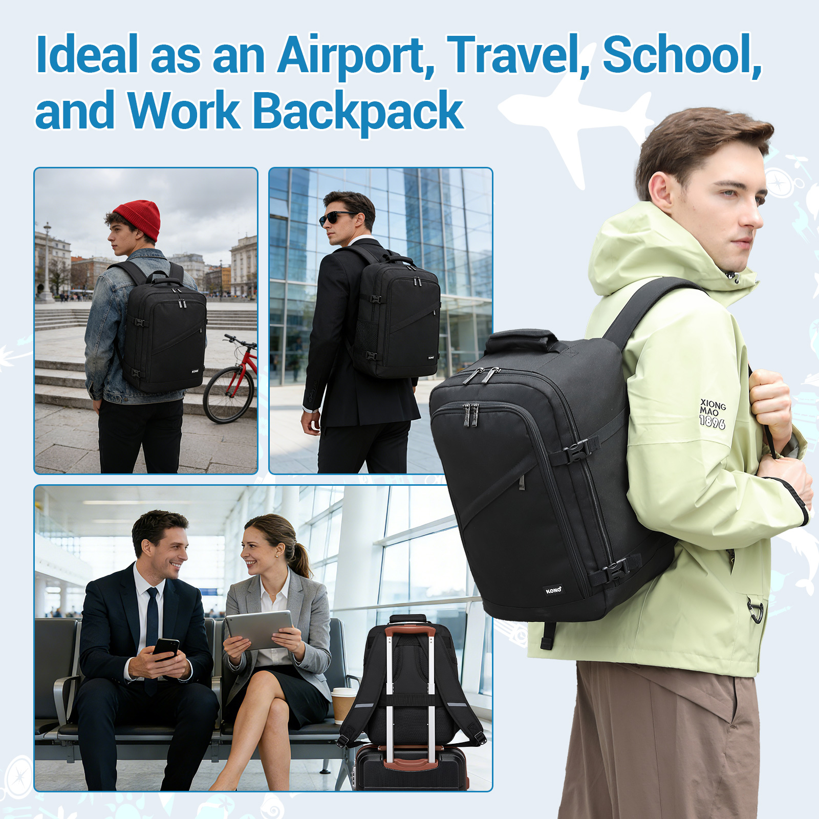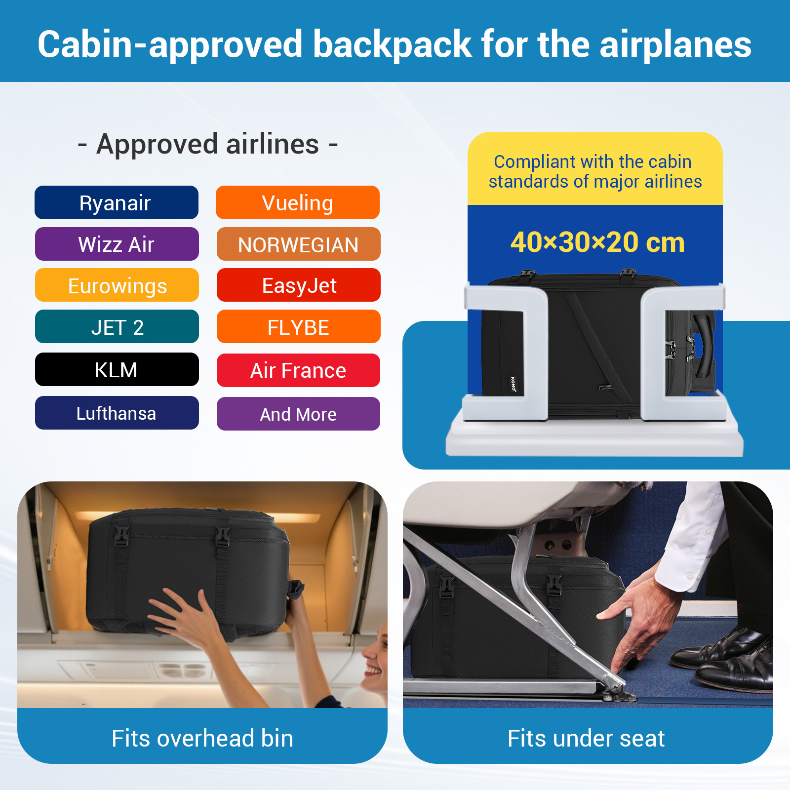 BPK2551 - Kono Flexible Cabin Backpack 30×20×40-Fits 15.6" Laptop, Clamshell Access-Great for Holidays, Work Trips & Commuting - Black