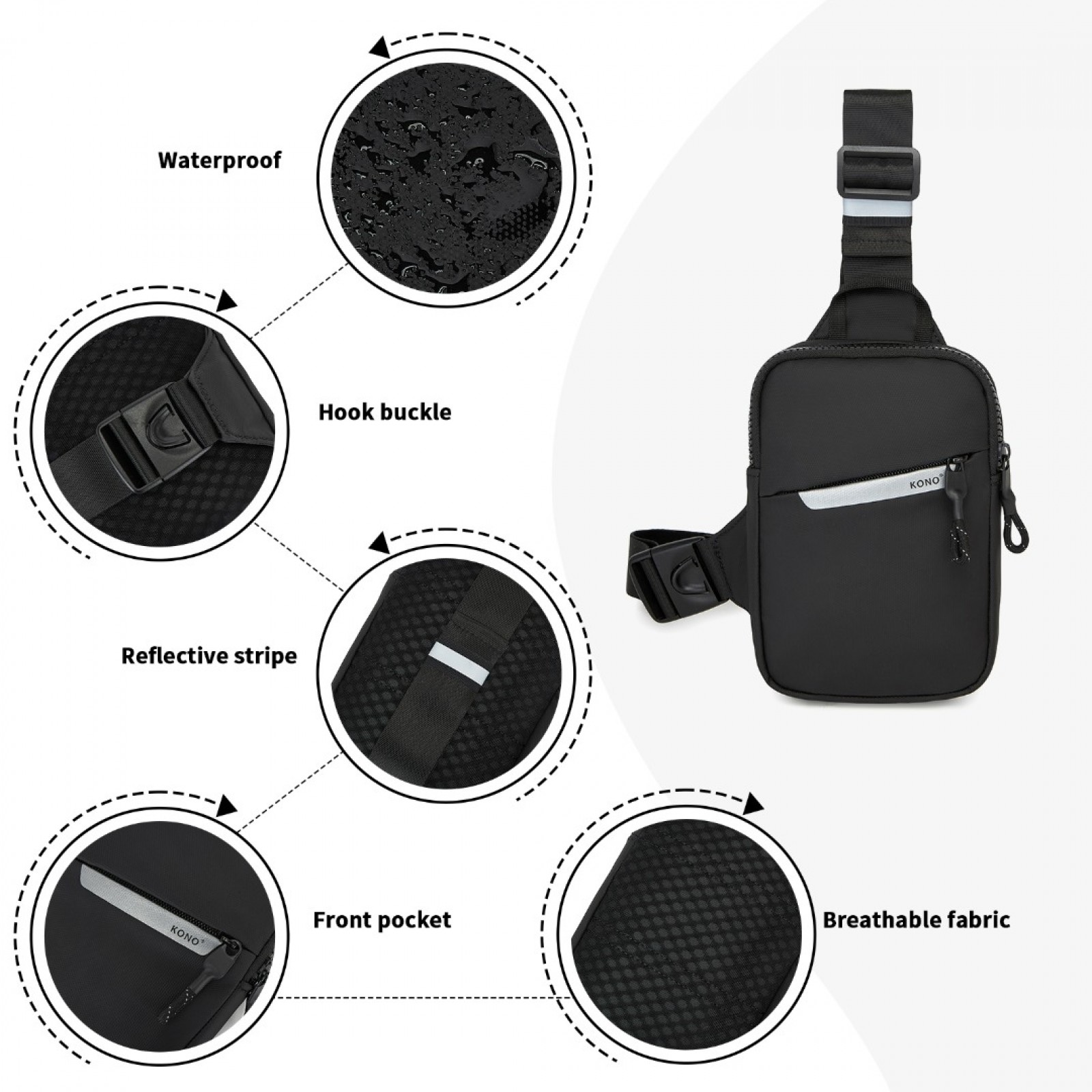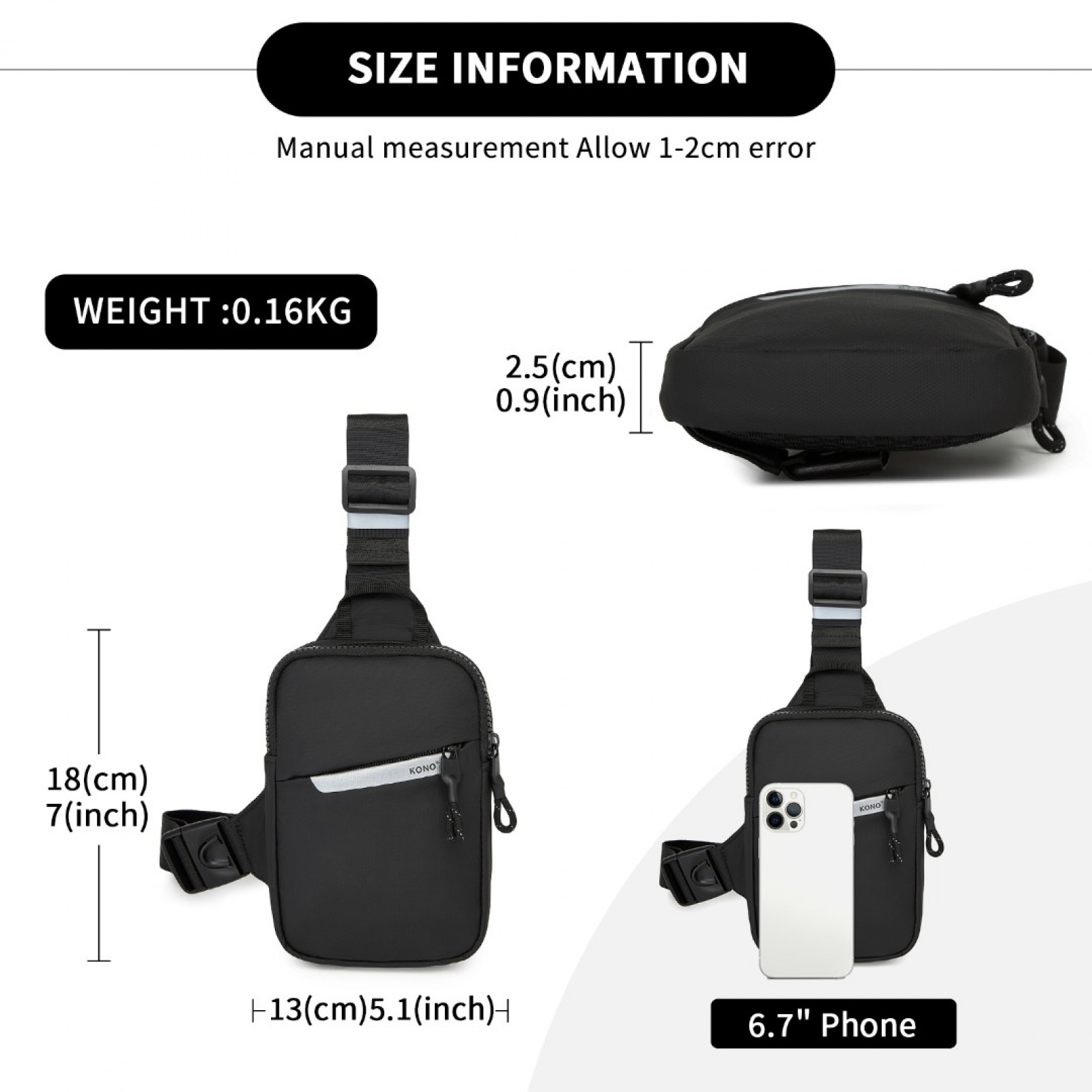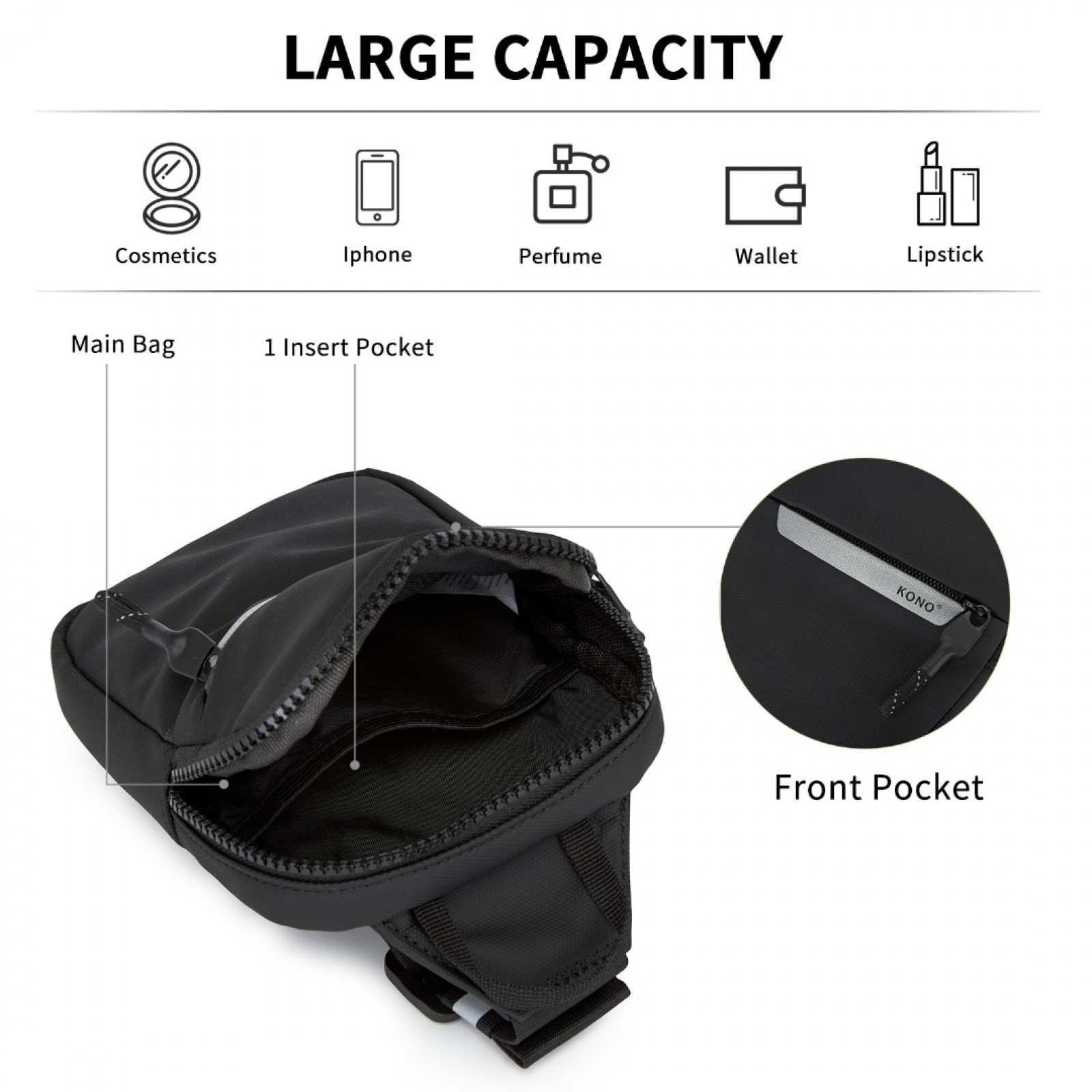 CEK2445 - Kono Lightweight Crossbody Sling Bag with Adjustable Strap Multiple Pockets for Travel and Everyday Use - Black