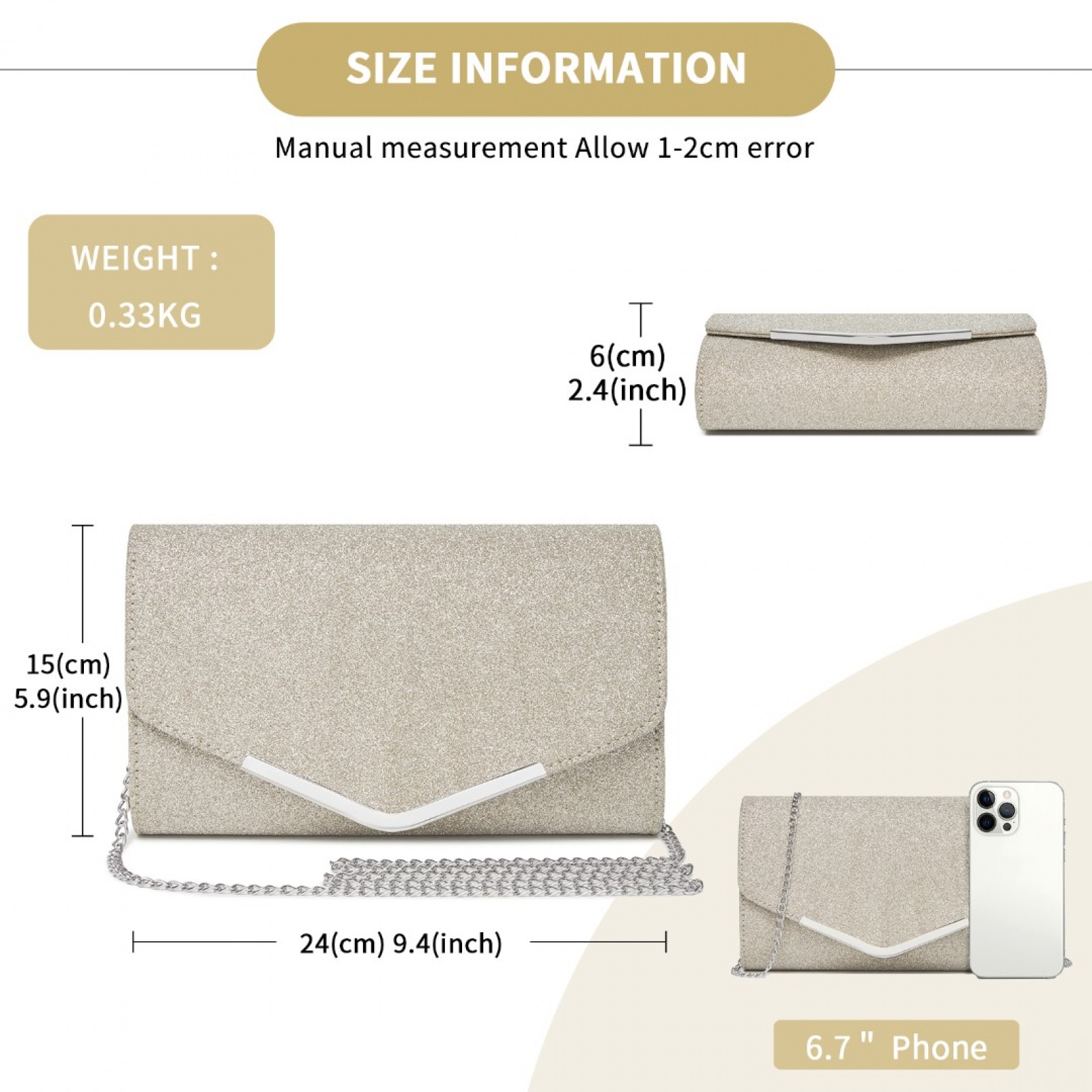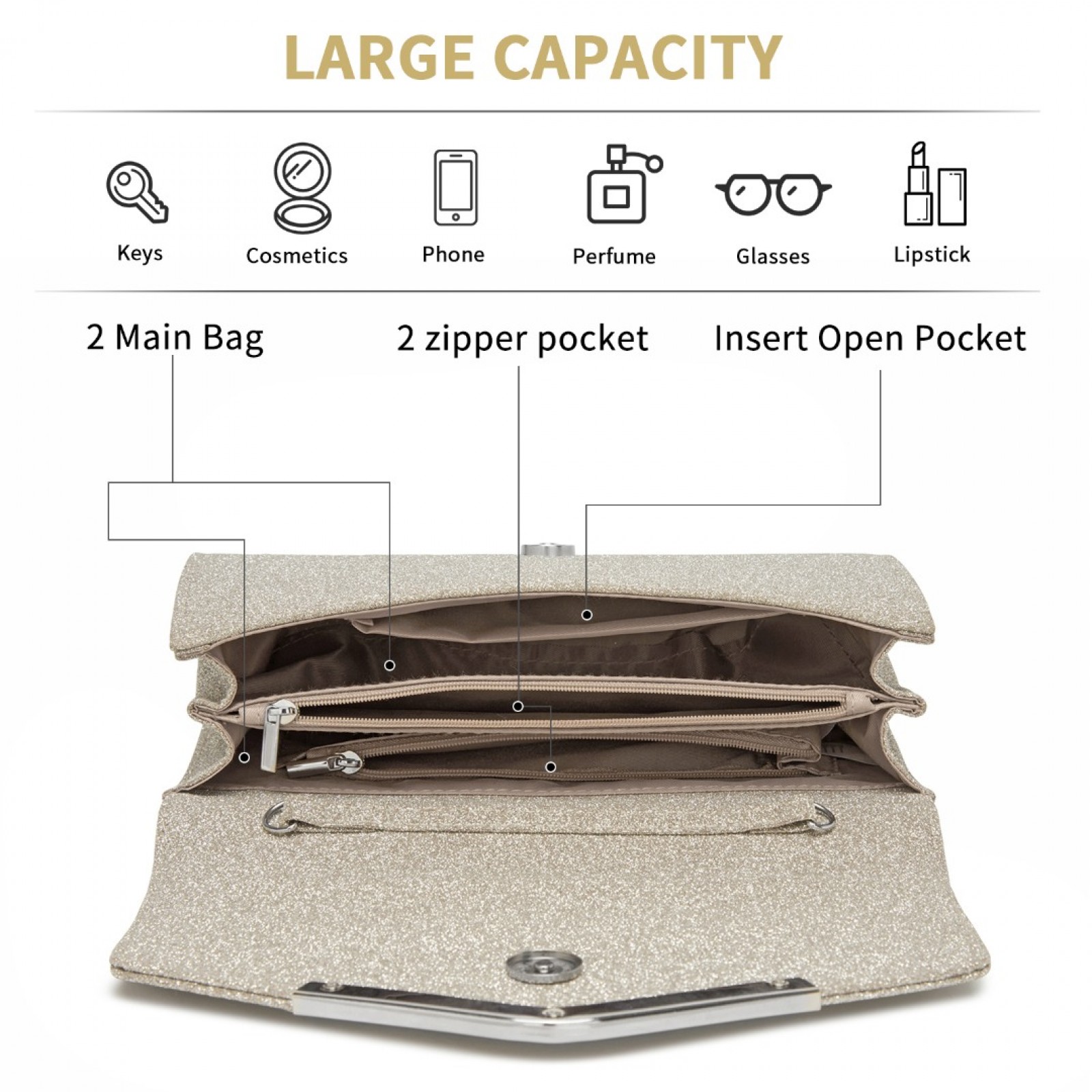 CLM2459 - Miss Lulu Women's Glitter Envelope Clutch with V-Metal Trim & Detachable Chain Strap - Gold