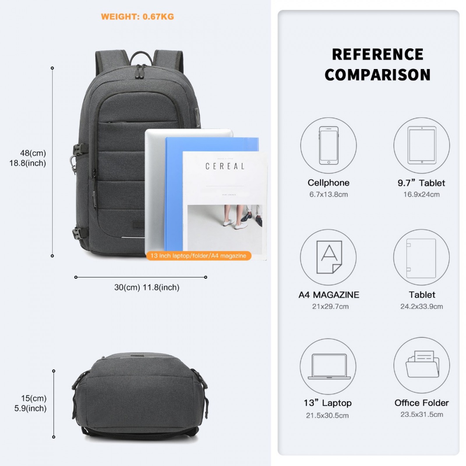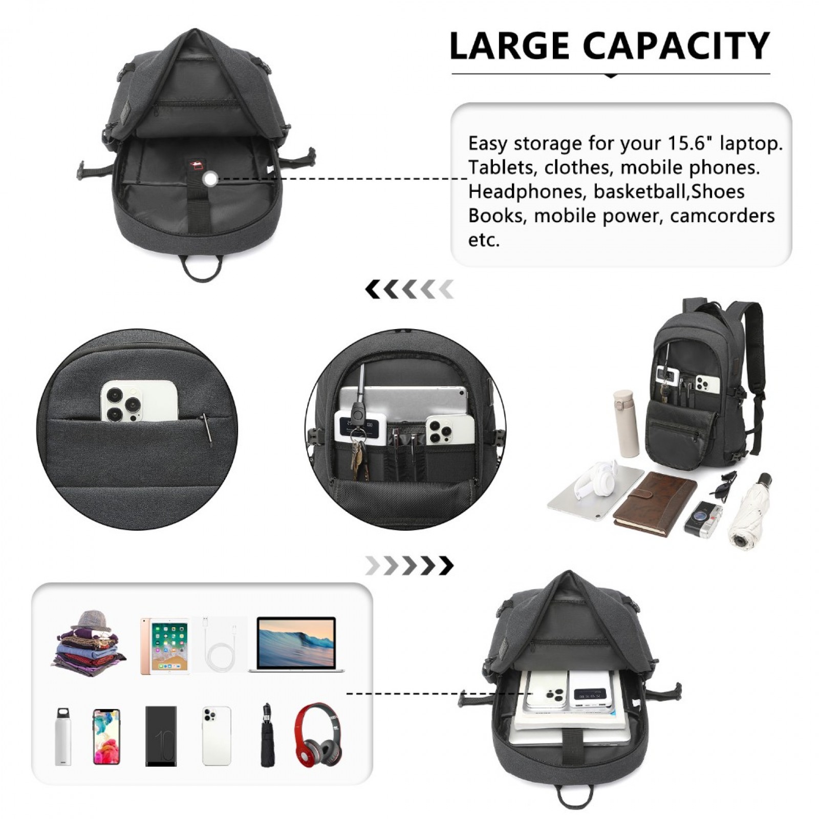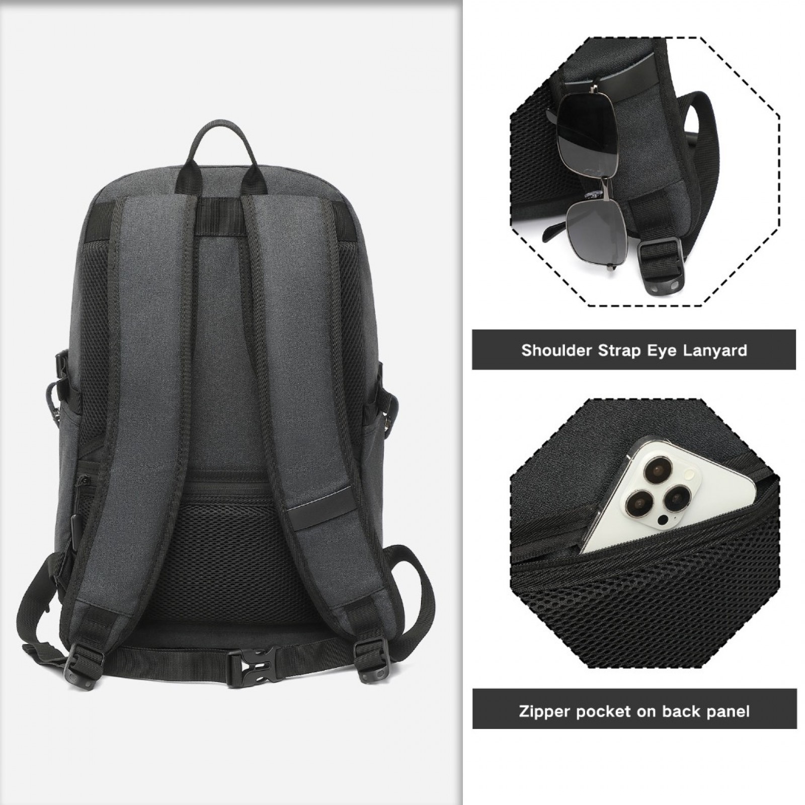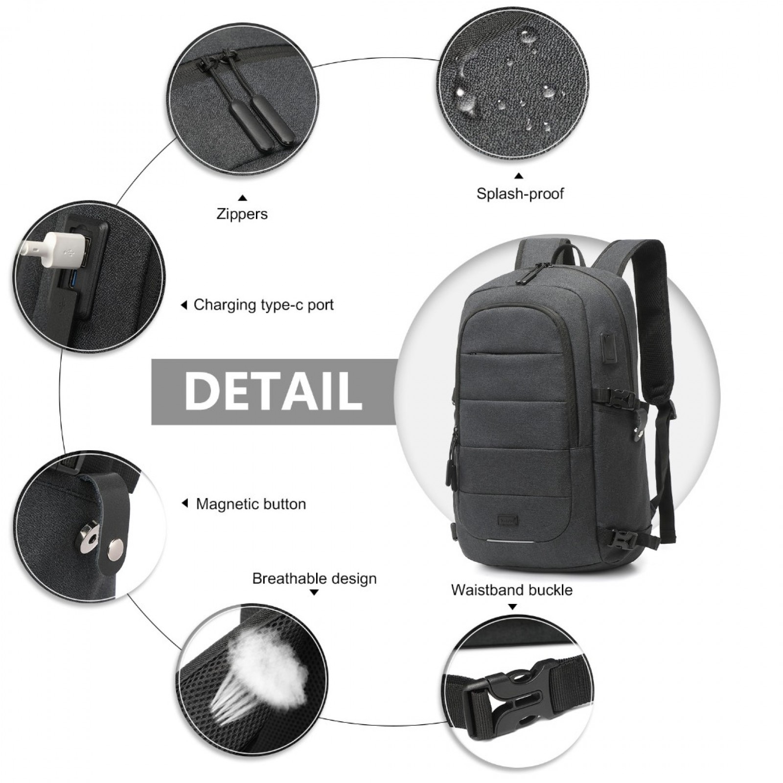 EM2347 - Kono Multi-Compartment Water-Resistant Backpack With USB Charging Port - Black