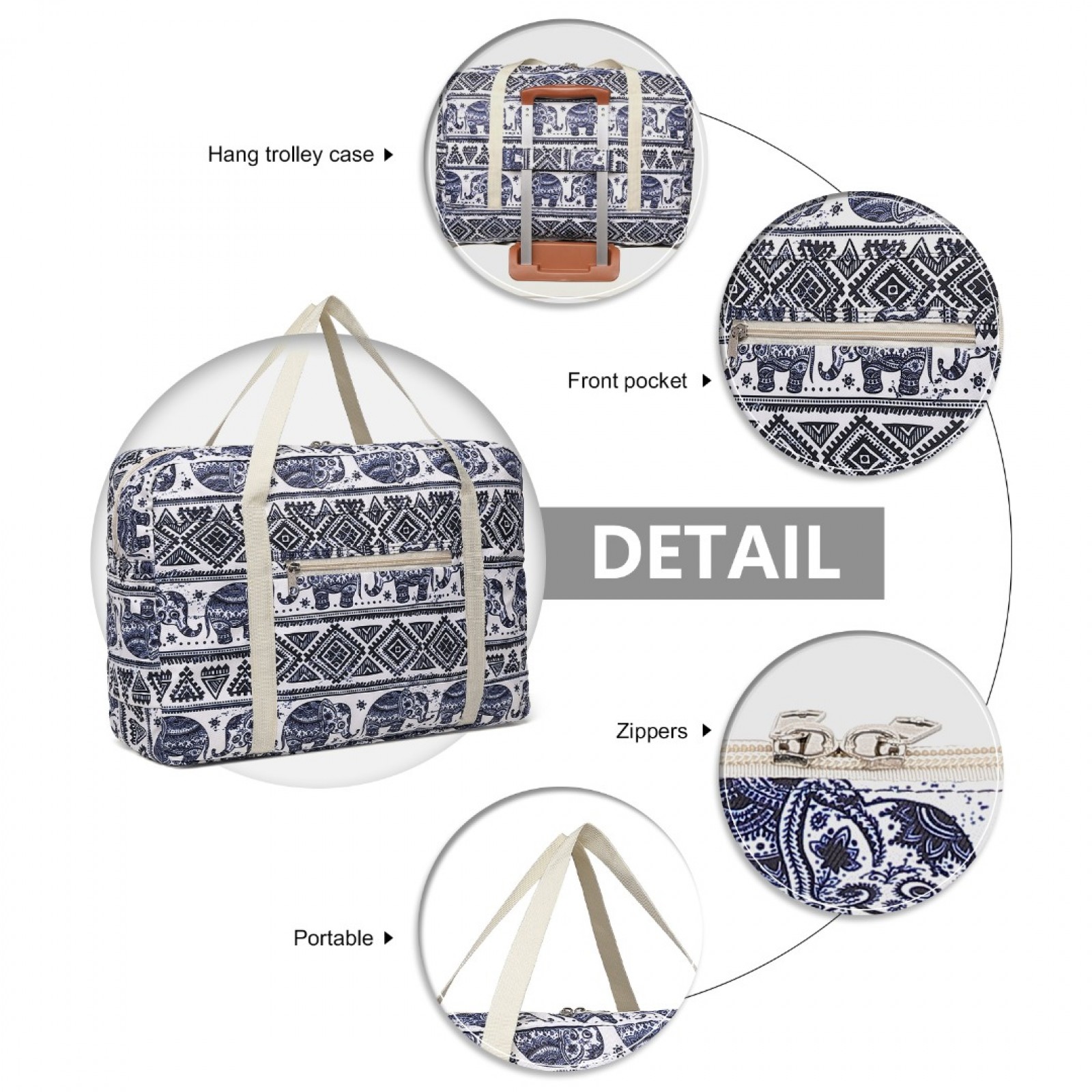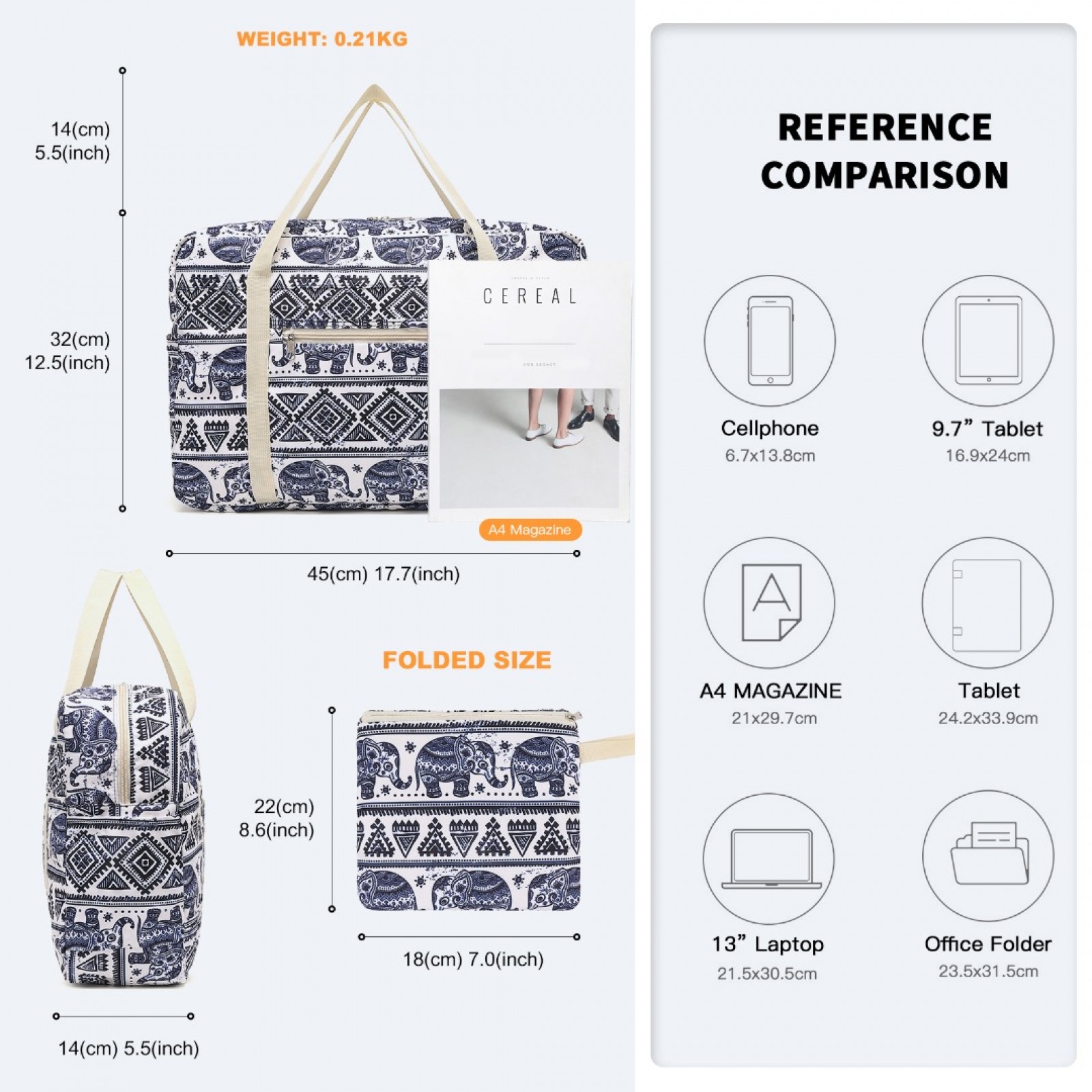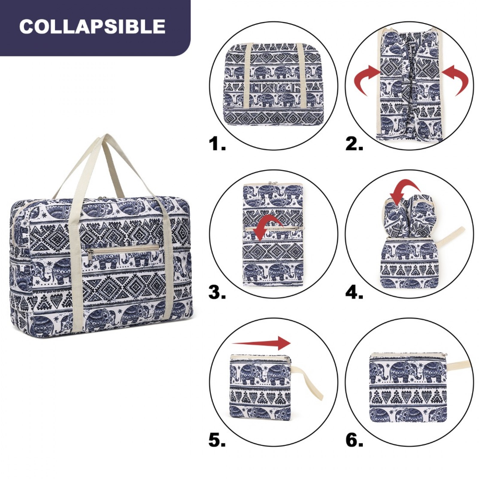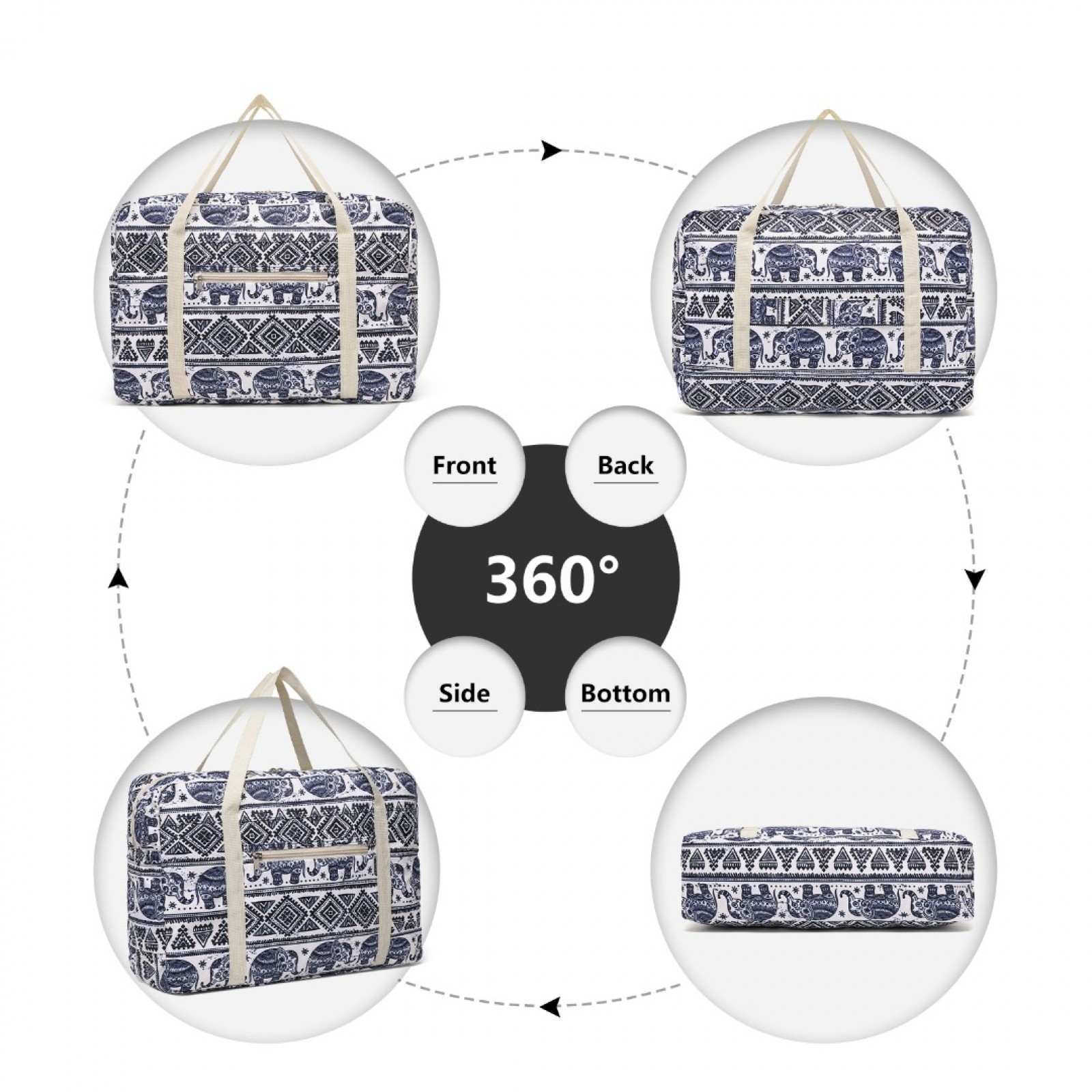 EQ2308E - Kono Foldable Waterproof Storage Cabin Travel Handbag Elephant Print - Navy And Beige