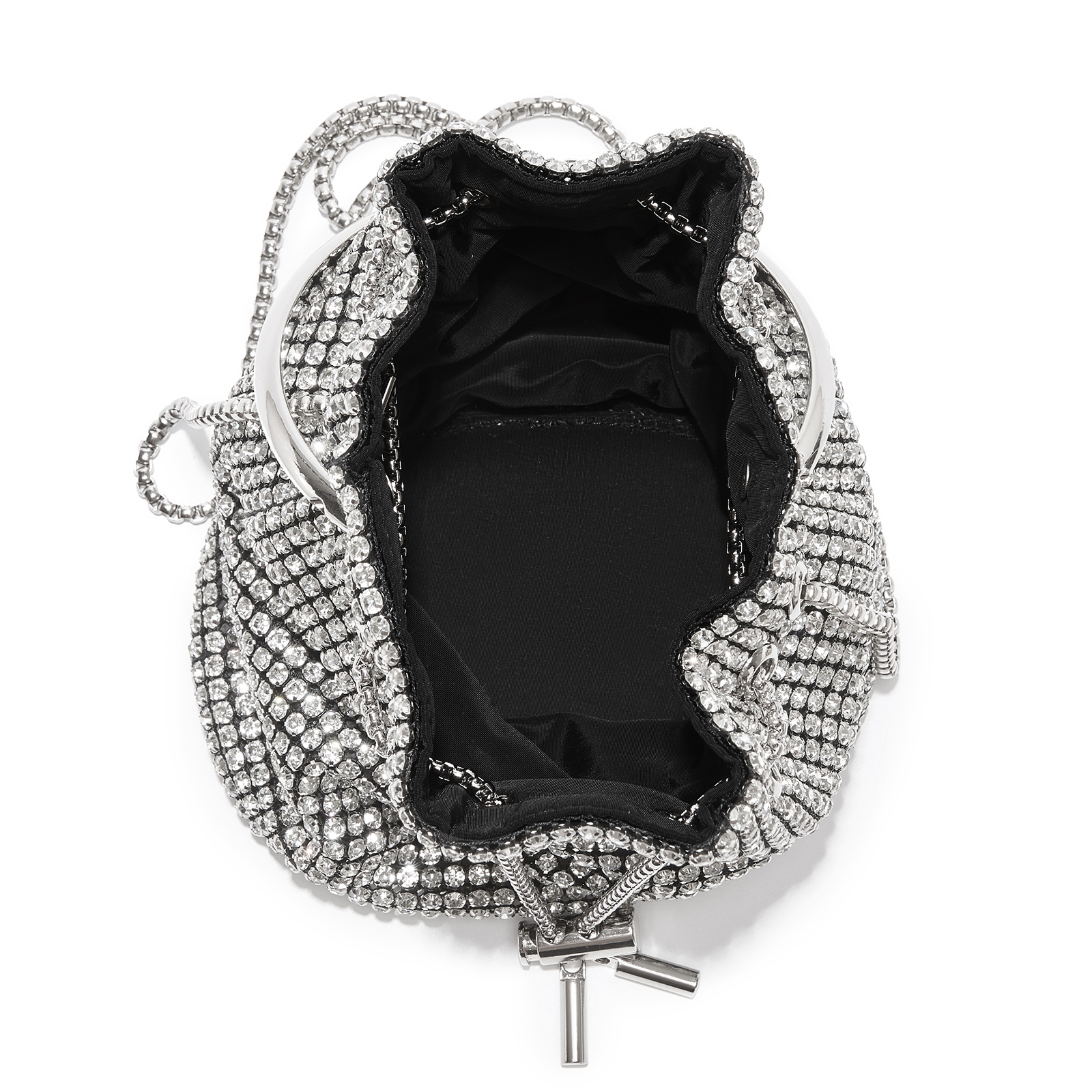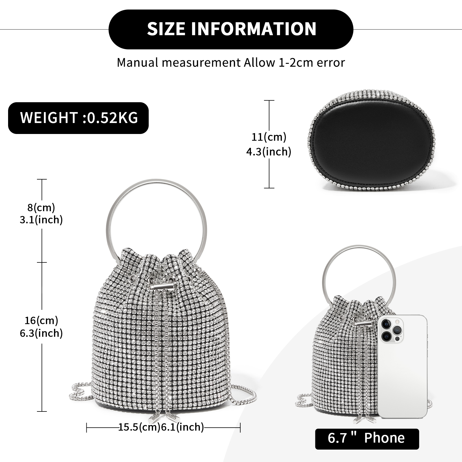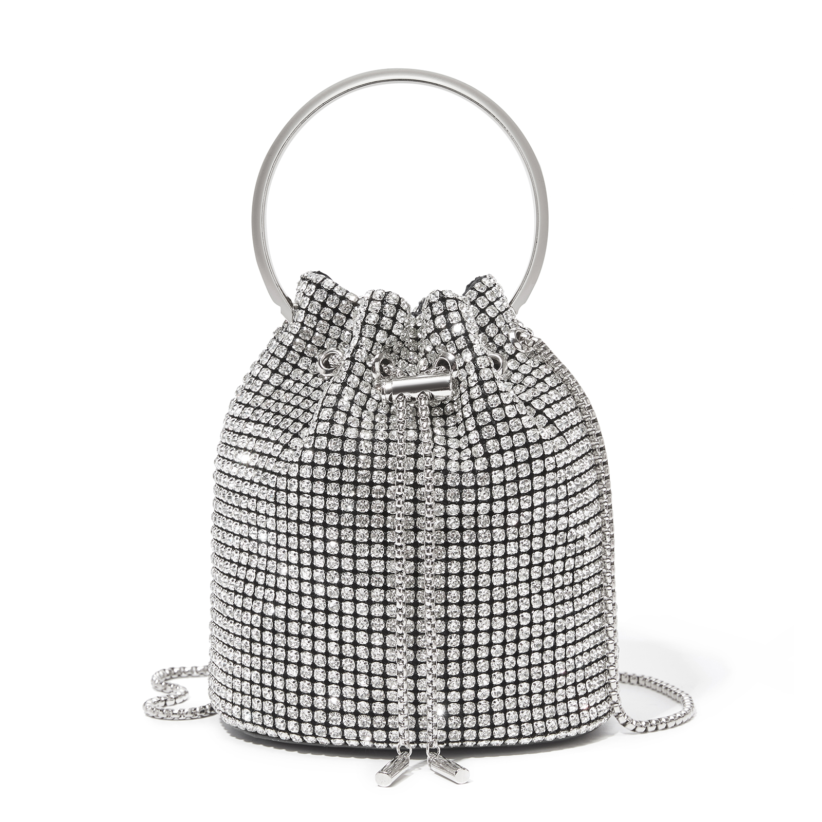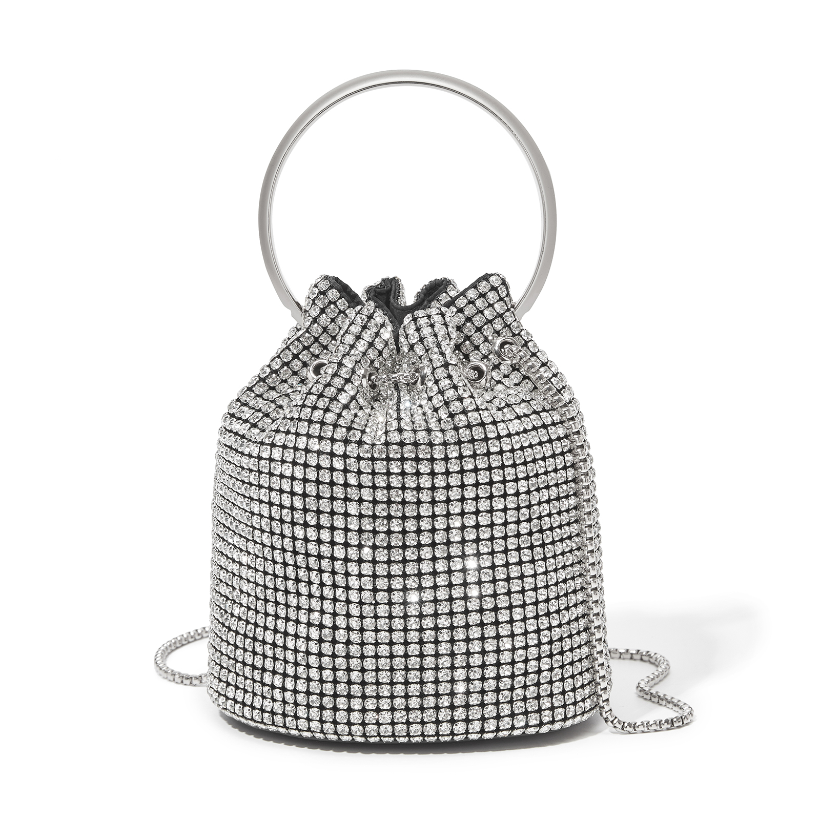 CLS2510 - Women's Rhinestone Evening Bag – Sparkly Handbag with Metal Ring Handle and Chain Crossbody Strap - Silver