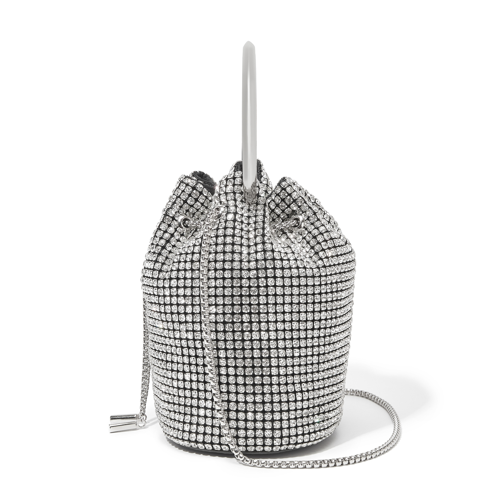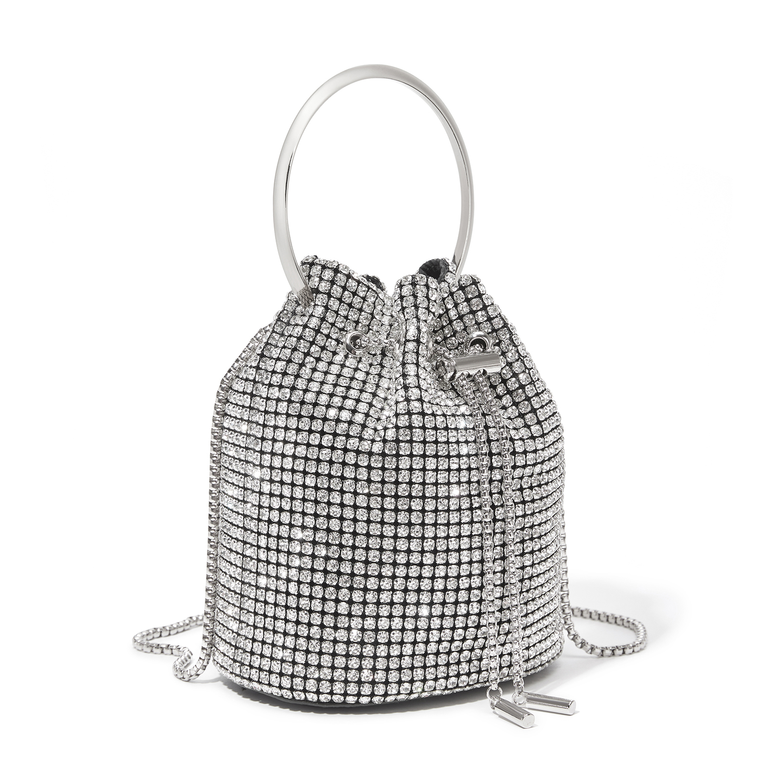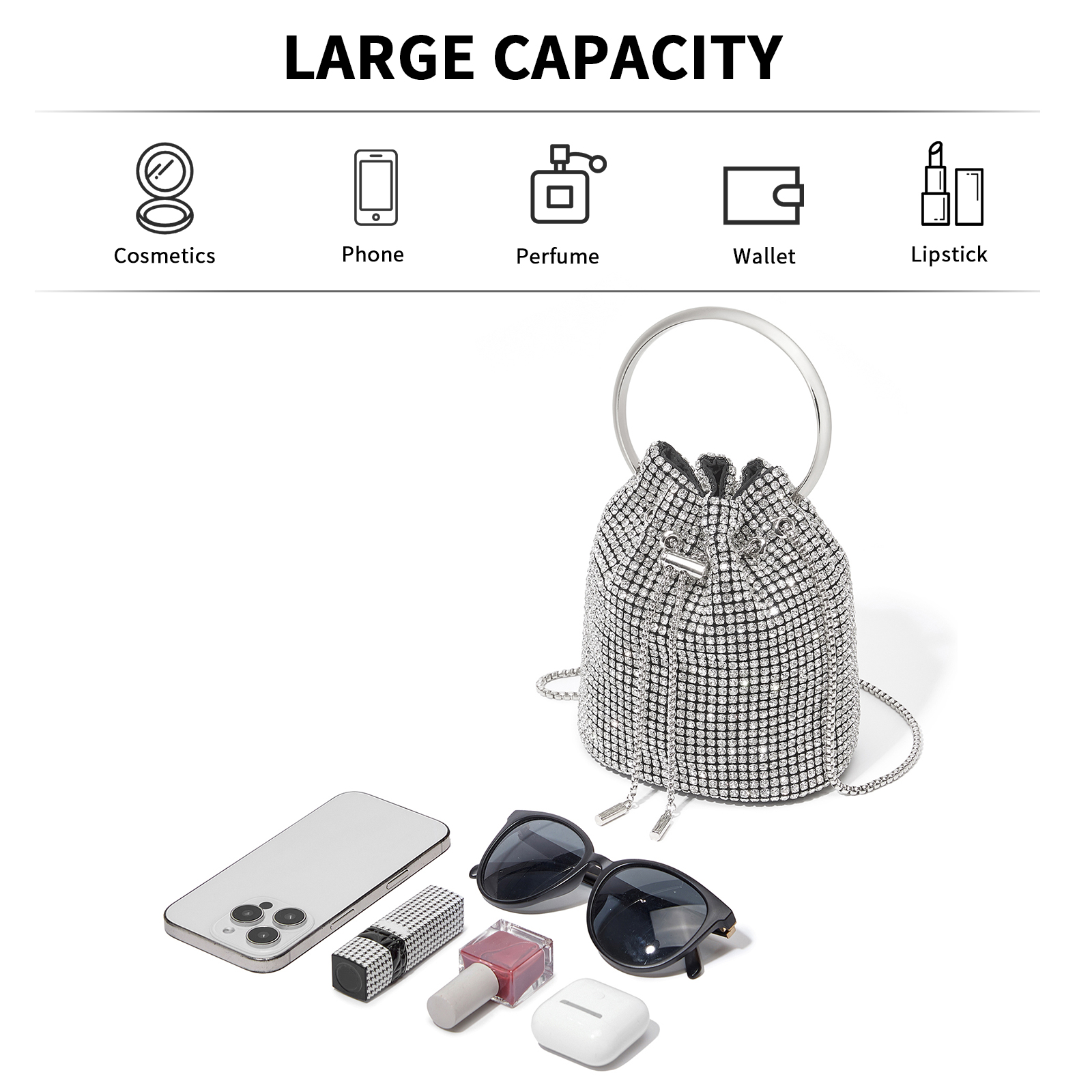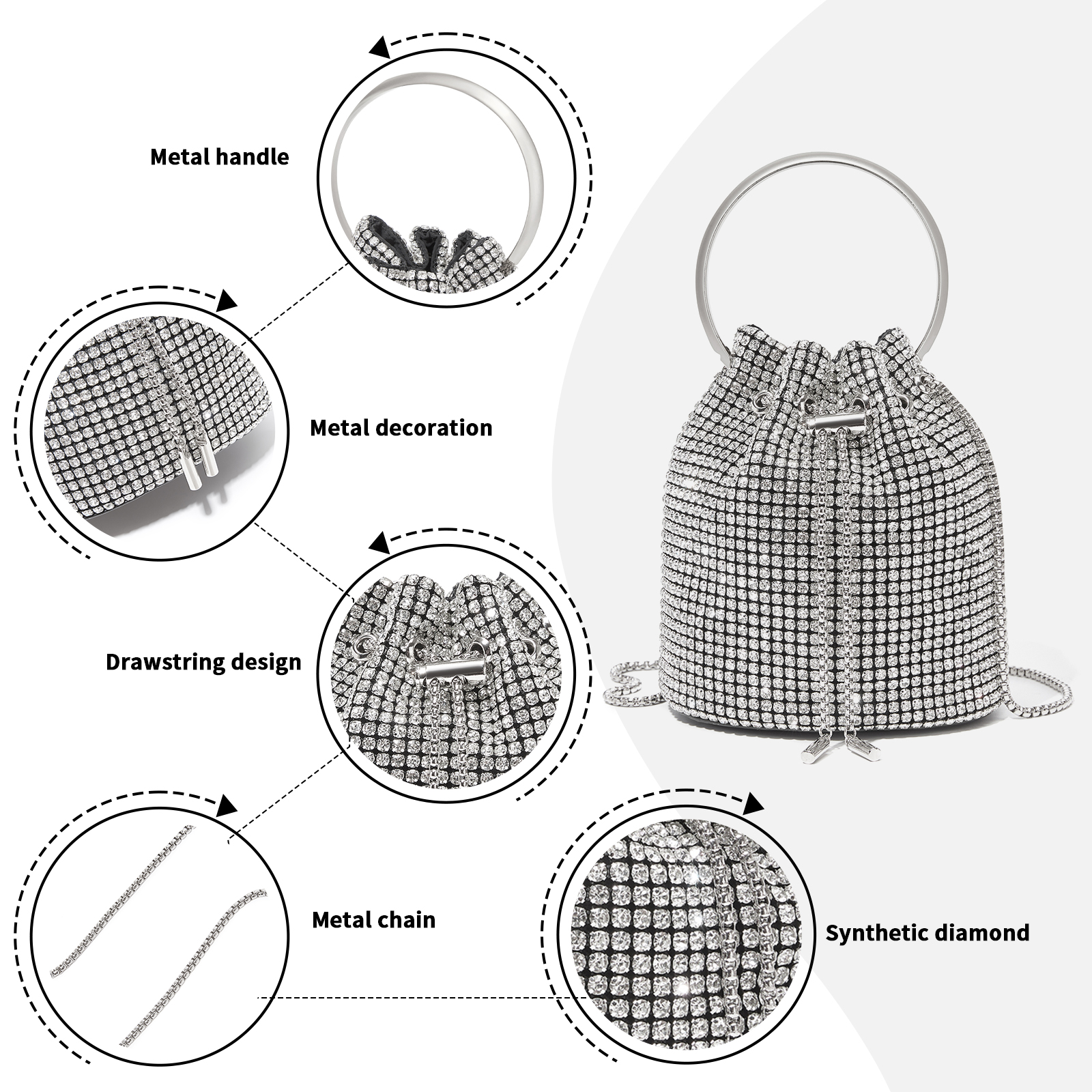 CLS2510 - Women's Rhinestone Evening Bag – Sparkly Handbag with Metal Ring Handle and Chain Crossbody Strap - Silver
