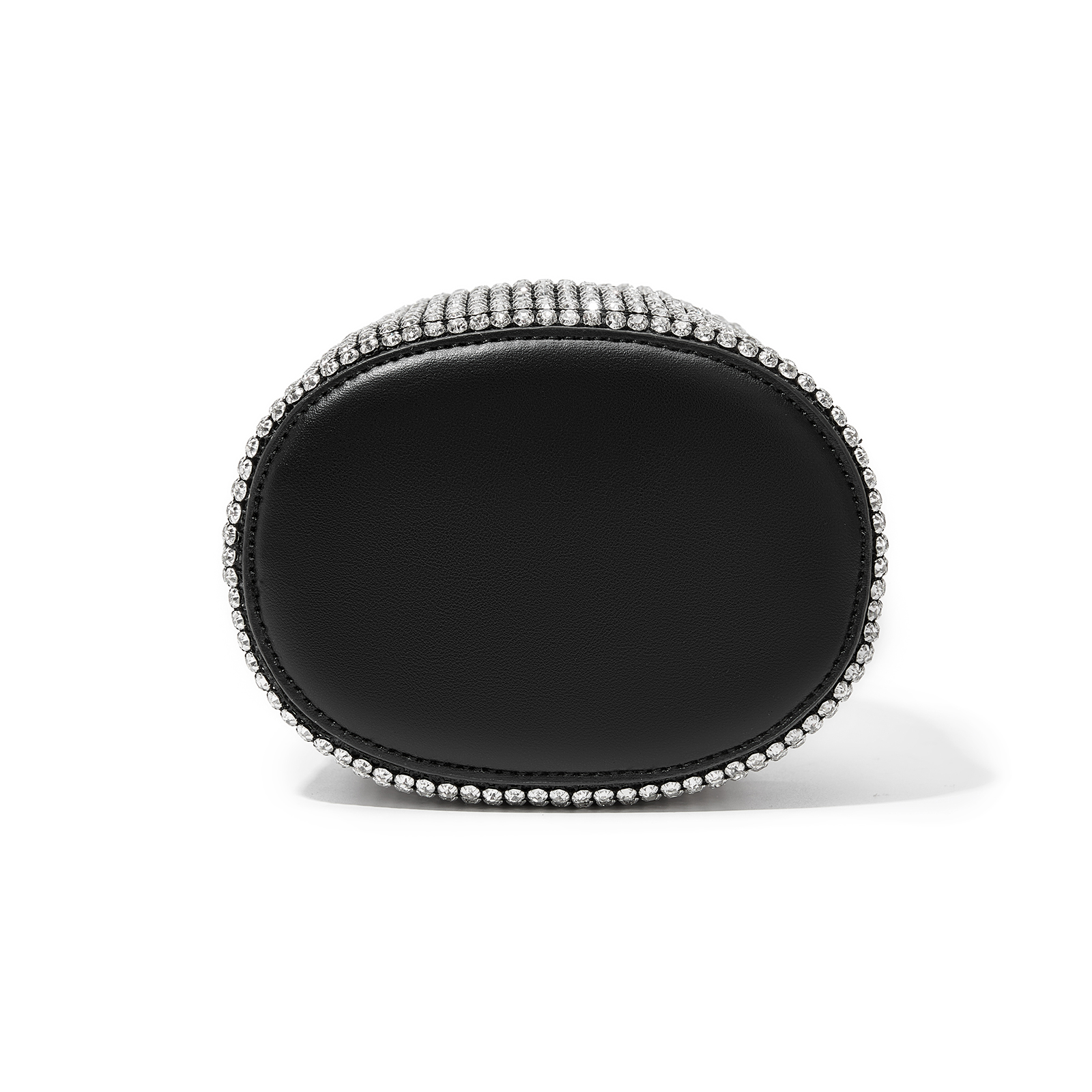 The body is covered with synthetic diamonds for a dazzling effect, while the base is made of PU leather for durability and structure, making it the perfect accessory for parties, weddings, or night outs.