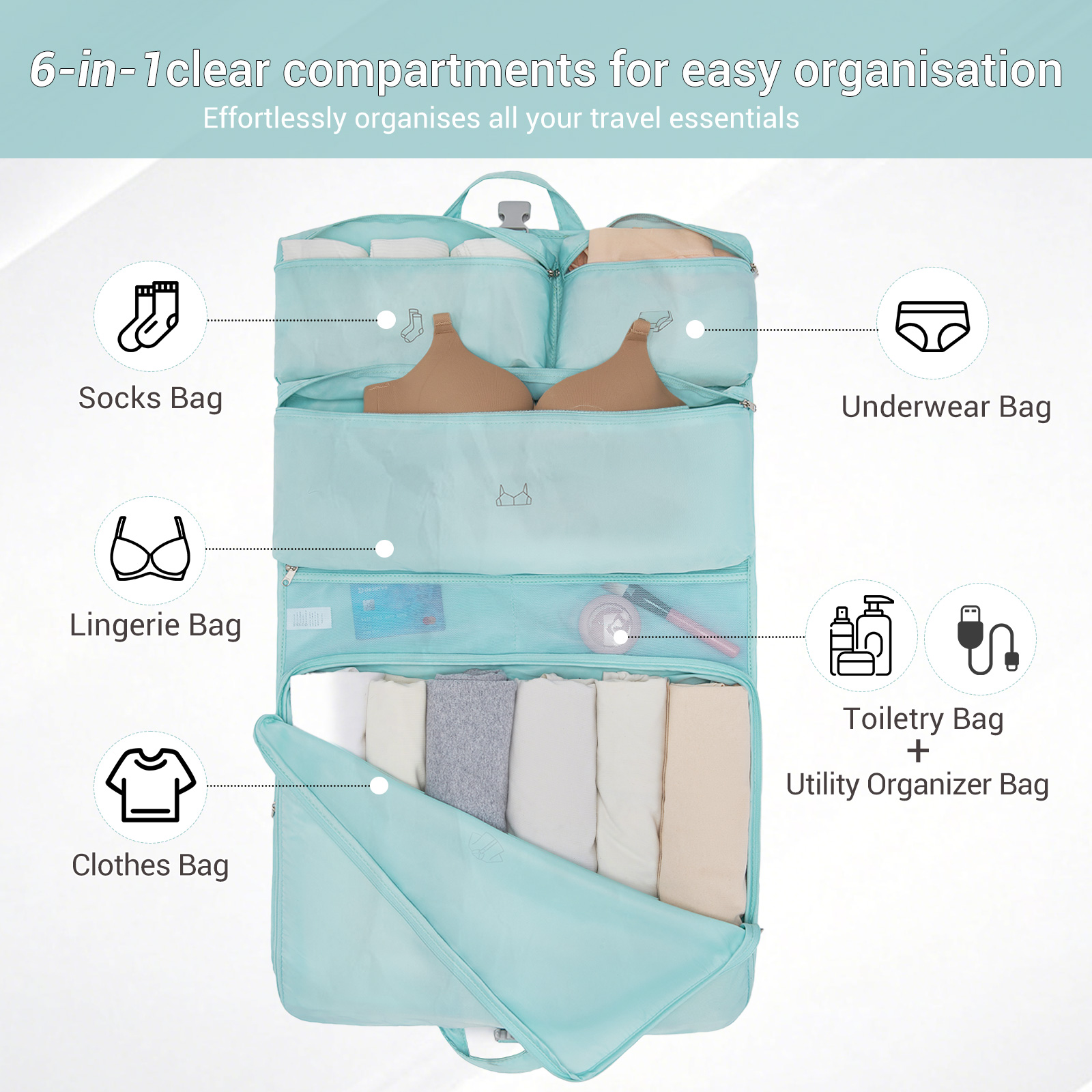 Unclip the central buckle and unfold the bag to reveal a smart hanging layout with dedicated zip compartments:1 x Socks zip bag,1 x Underwear zip bag,1 x Bra zip bag,1 x Clothes zip bag,2 x Mesh zip pockets for toiletries, cosmetics or travel essentials.