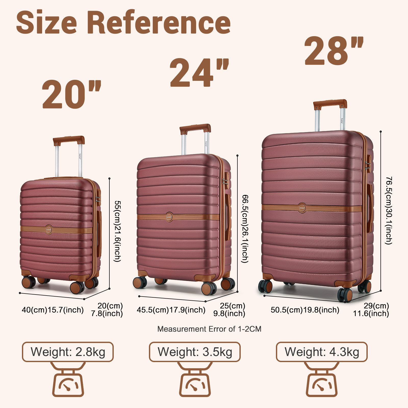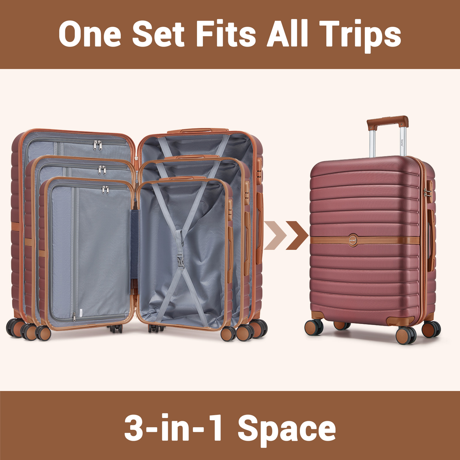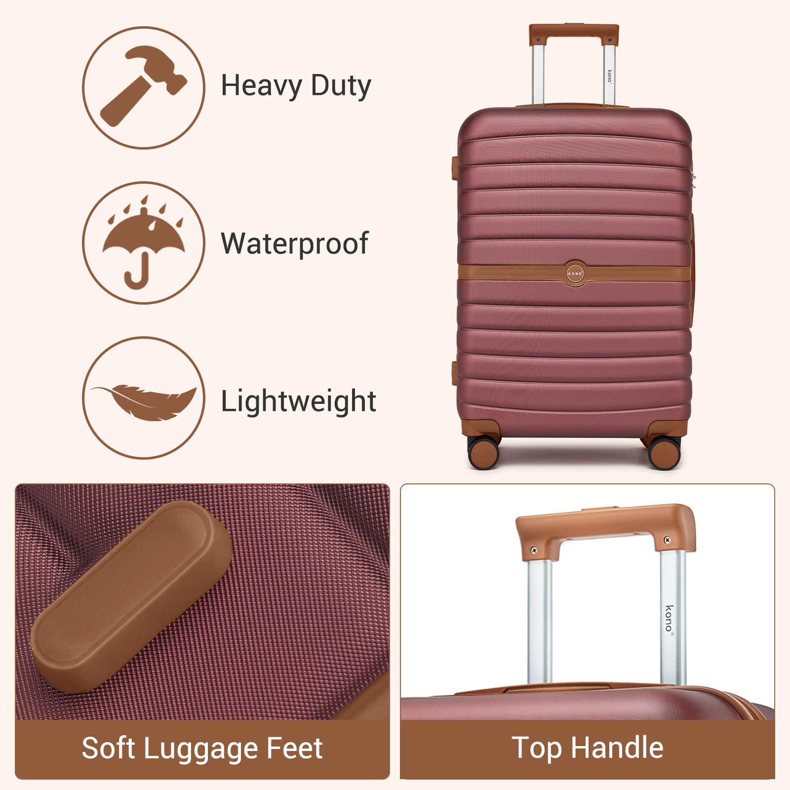 KSK2592 - Kono ABS+PC Striped Design with Colour-Block Details 3-Piece Hardshell Luggage Set with Spinner Wheels - Burgundy and Brown