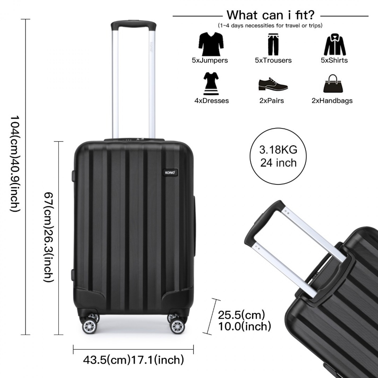 K1773-1L - Kono 19/24/28 Inch 3 Piece Set Striped ABS+PC Hard Shell Luggage with 360-Degree Spinner Wheels - Black
