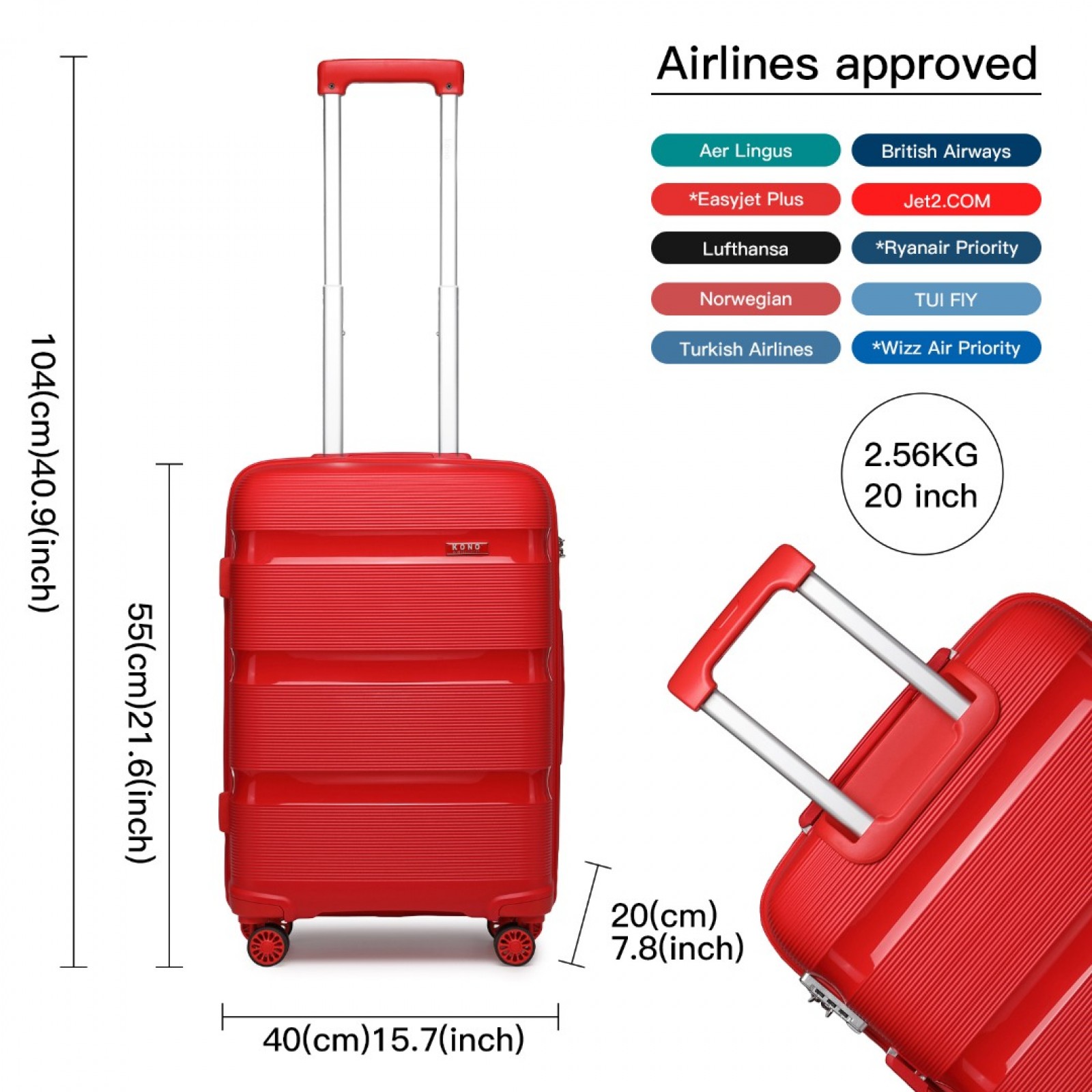 K2092L - Kono 20 Inch Bright Hard Shell PP Carry-On Suitcase In Cabin Size - Red