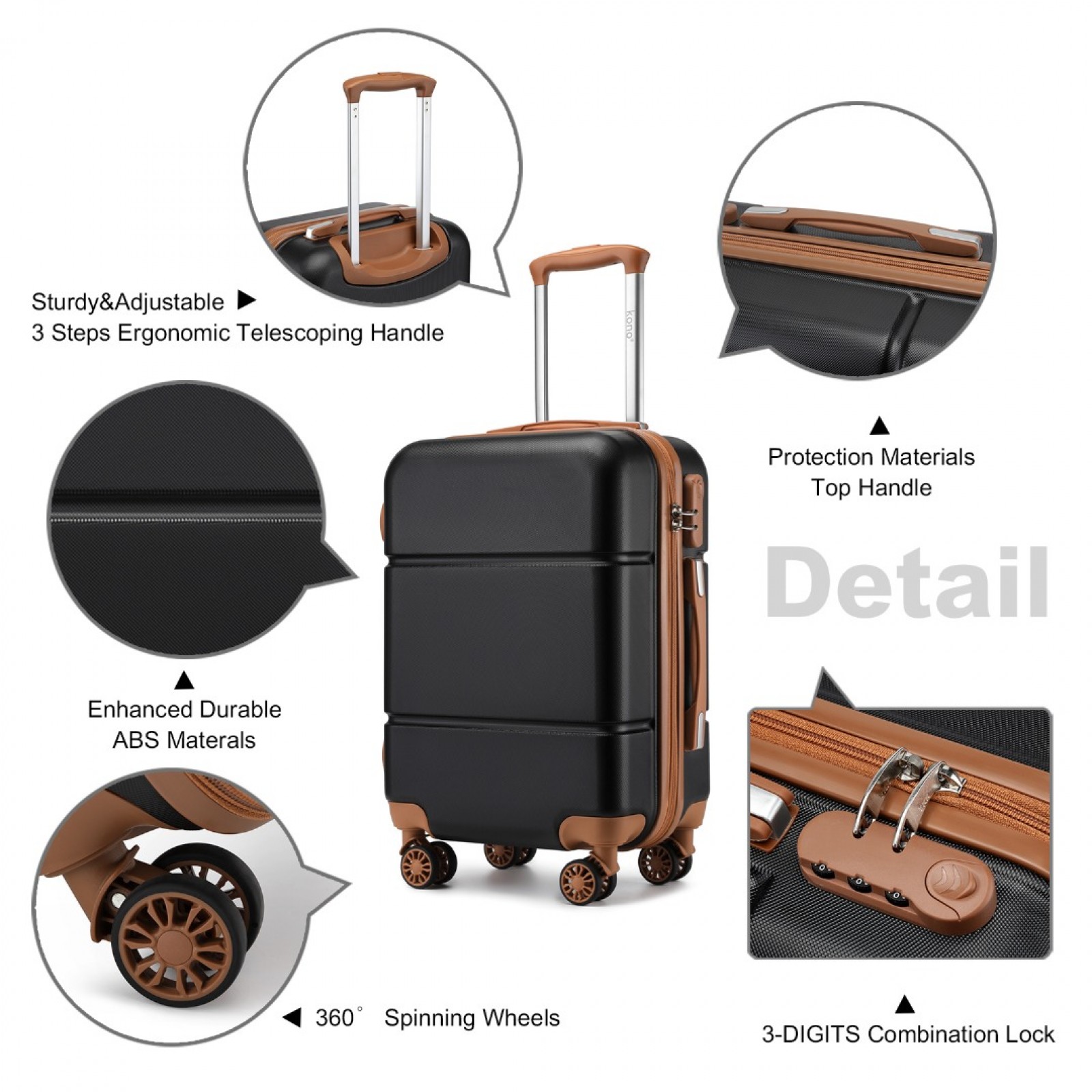 KSK2485 - Kono 20 Inch Premium ABS Cabin Carry-On Suitcase with Secure Combination Lock for Effortless Travel - Black And Brown