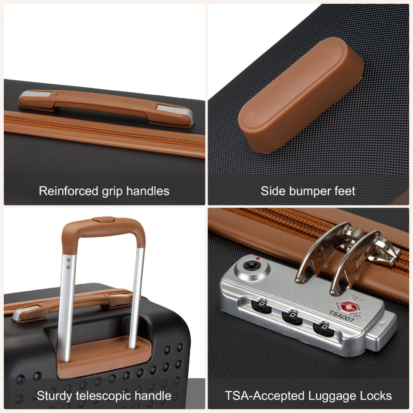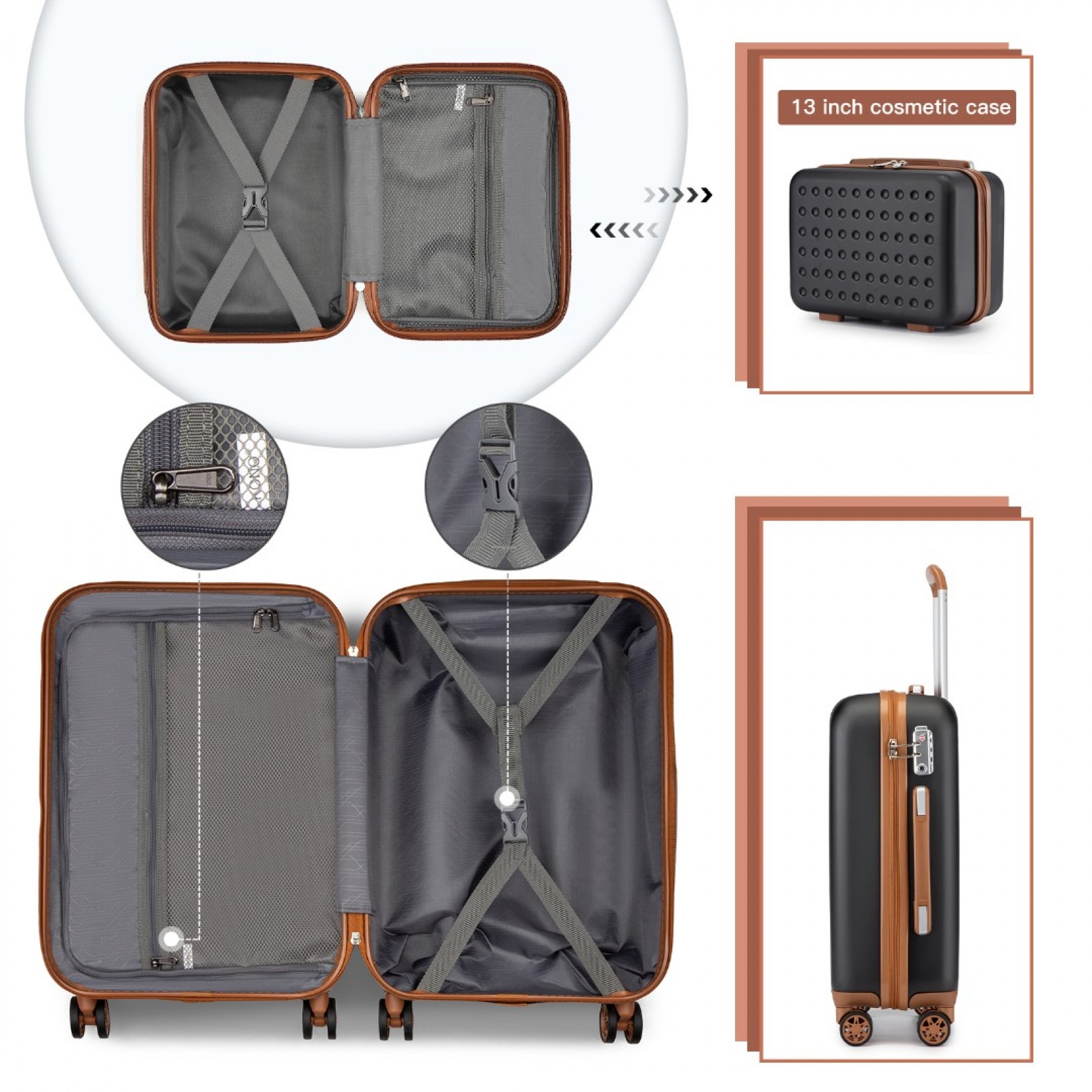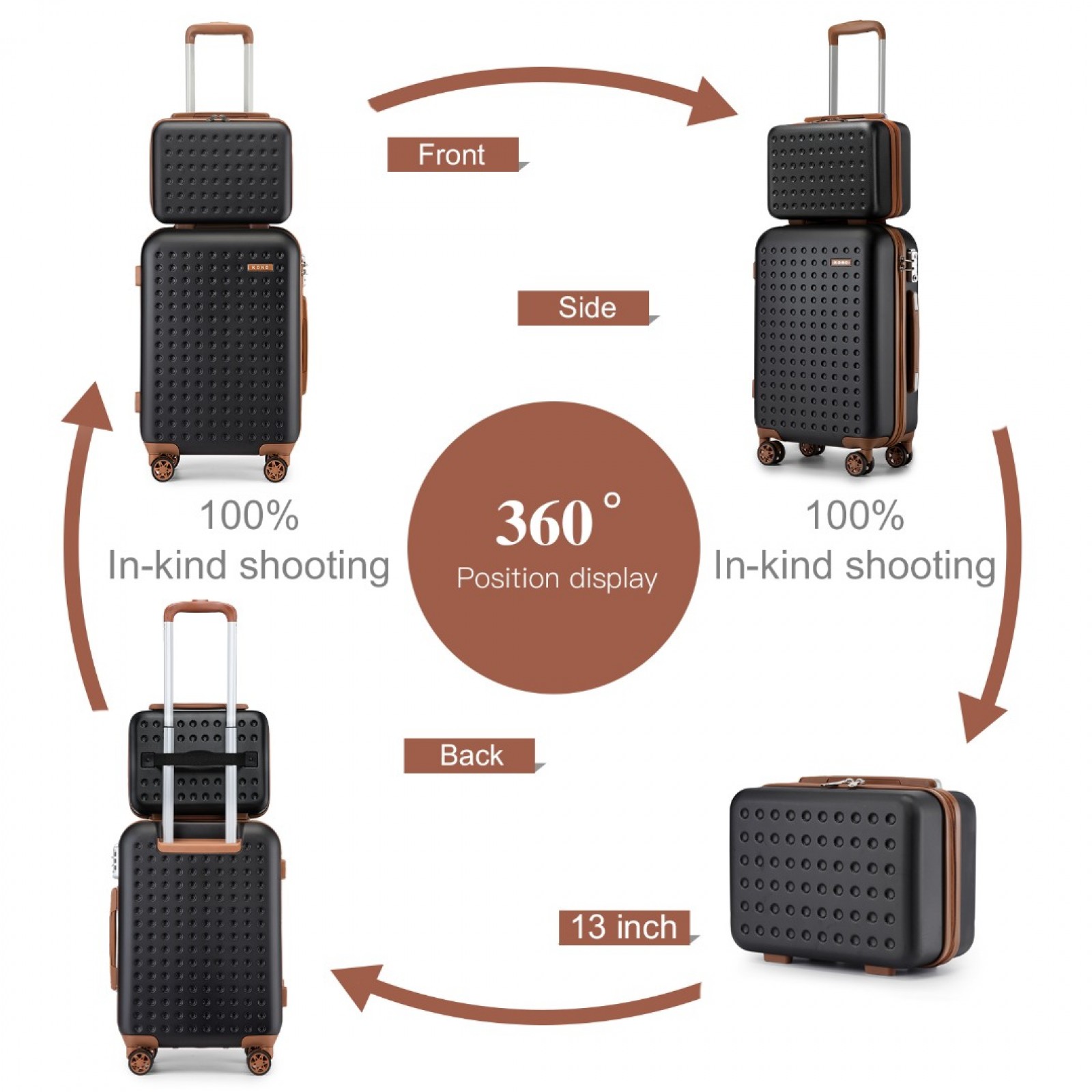 KSK2486 - Kono Stylish ABS+PC Polka Dot Hard Shell Suitcase With TSA Lock And Vanity Case 4 Piece Set - Black And Brown