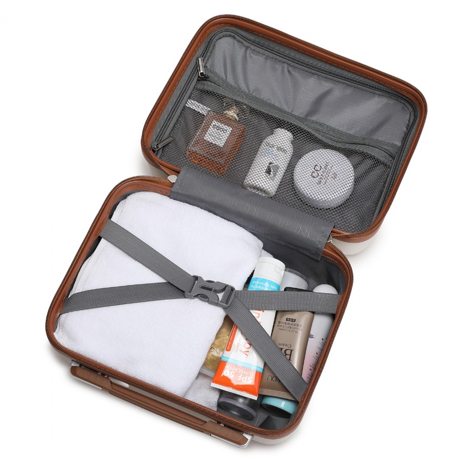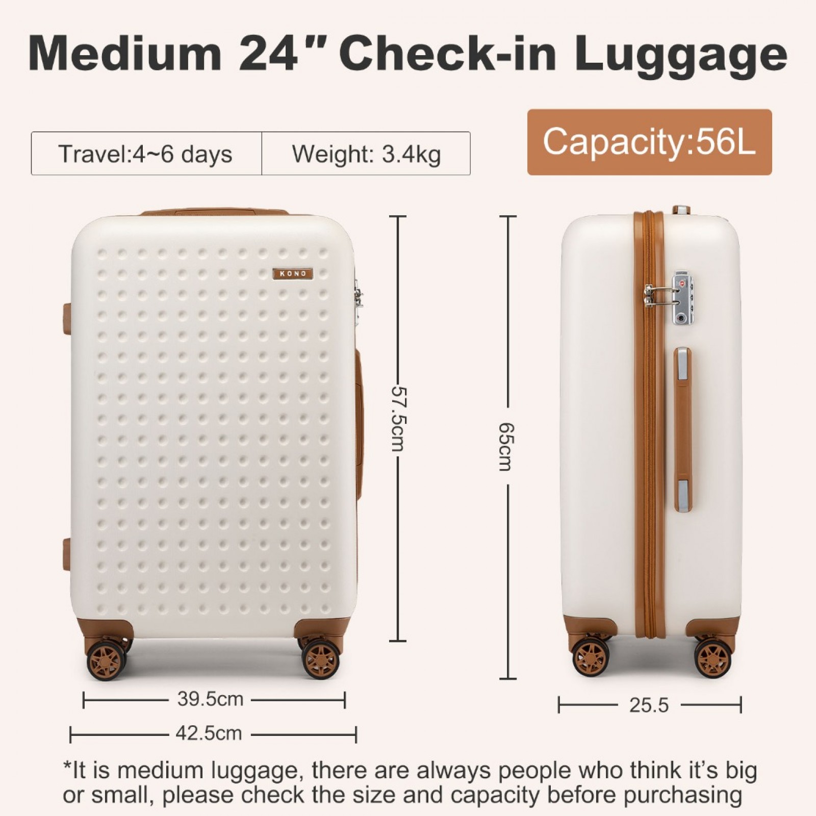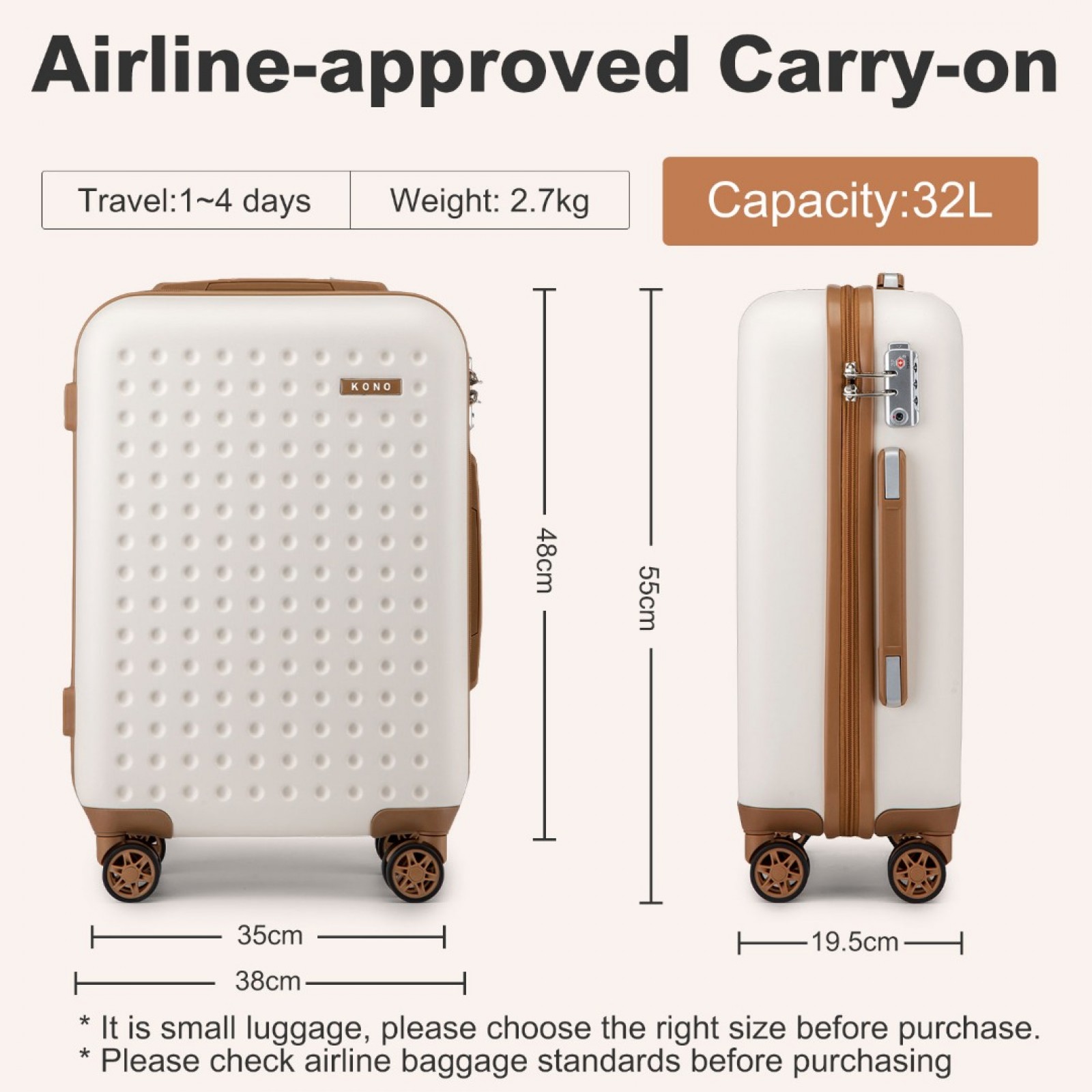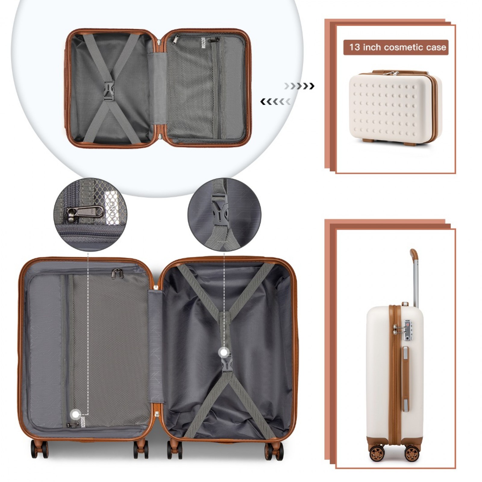 KSK2486 - Kono Stylish ABS+PC Polka Dot Hard Shell Suitcase With TSA Lock And Vanity Case 4 Piece Set - Cream And Brown