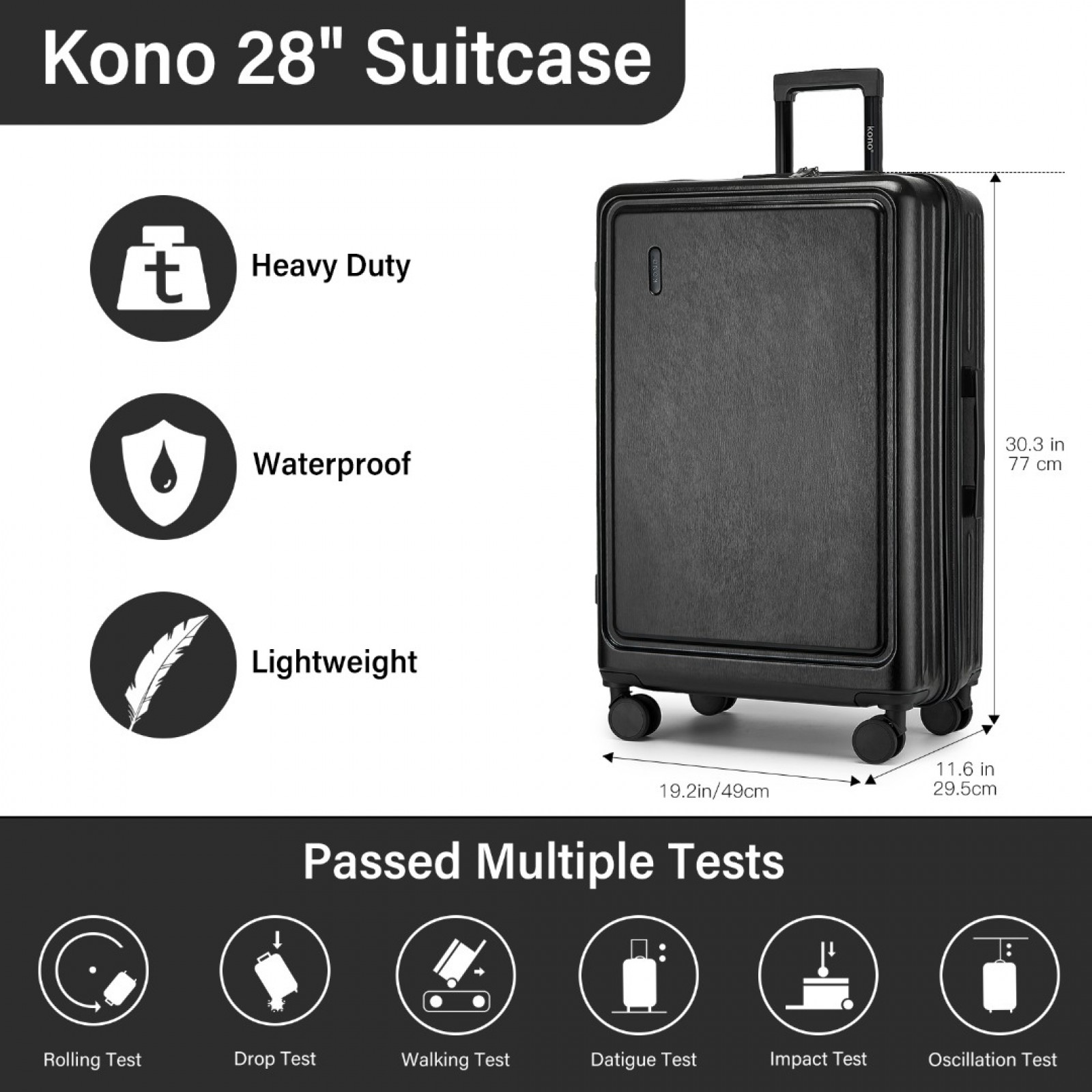 KSK2493 - Kono Durable 28 Inch ABS+PC Hardshell Suitcase with TSA Lock Lightweight Travel Luggage with 360° Spinner Wheels - Black