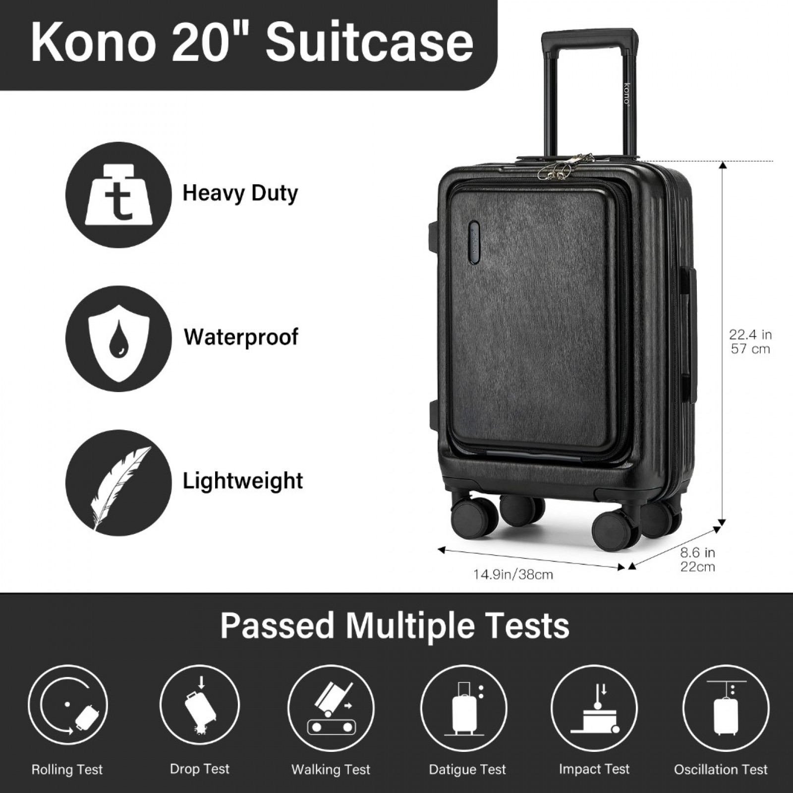 KSK2493 - Kono Durable ABS+PC 20 inch Carry-On Hardshell Suitcase with TSA Lock & Front Laptop Compartment - Black