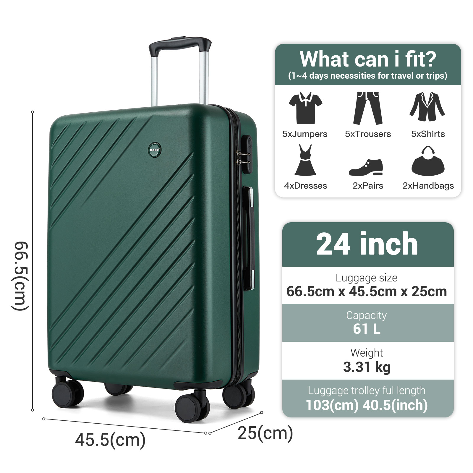 KSK2585 - Kono 24 Inch Medium ABS+PC Hard Shell Checked Luggage, Modern Diagonal Stripe Travel Suitcase with Silent Spinner Wheels, Combination Lock - Green