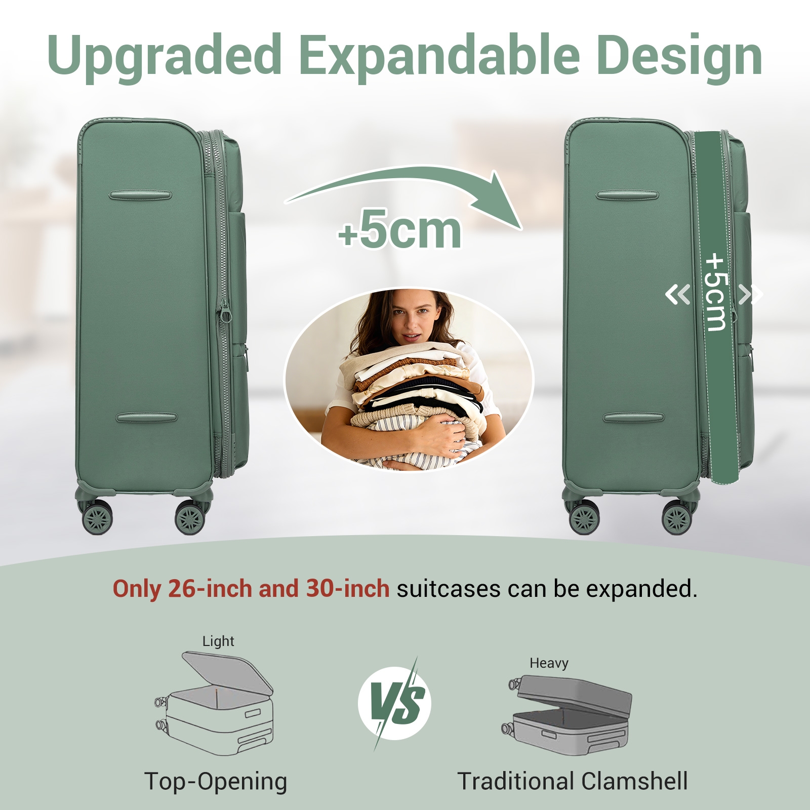 More space when you need it: An expandable zip adds up to 5cm of depth—perfect for souvenirs or extra layers(Available only in 26-inch and 30-inch sizes).