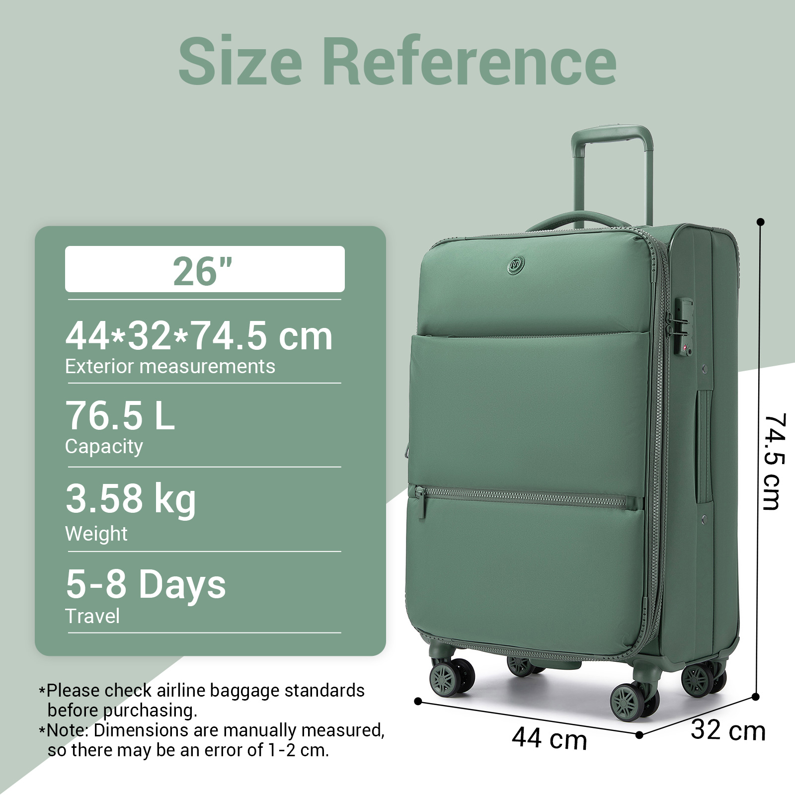 26 inch - 74.5cm (H) * 44cm (W) * 32cm (D) / 29.3″(H) * 17.3″(W) * 12.6″(D);3.58 kg;approx. 76.5 L