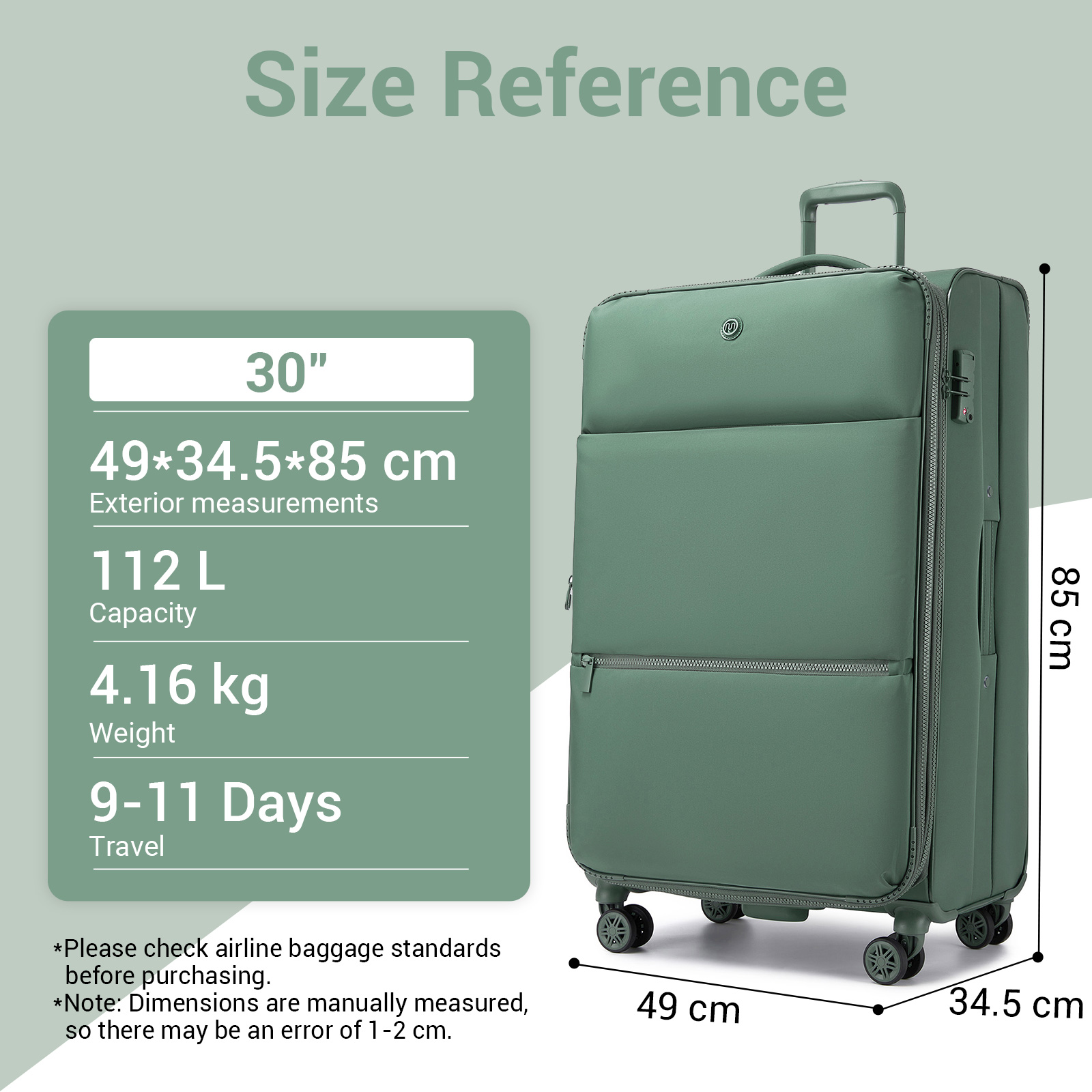 30 inch - 85cm (H) * 49cm (W) * 34.5cm (D) / 33.5" (H) × 19.3" (W) × 13.6" (D);4.16 kg; approx. 112 L