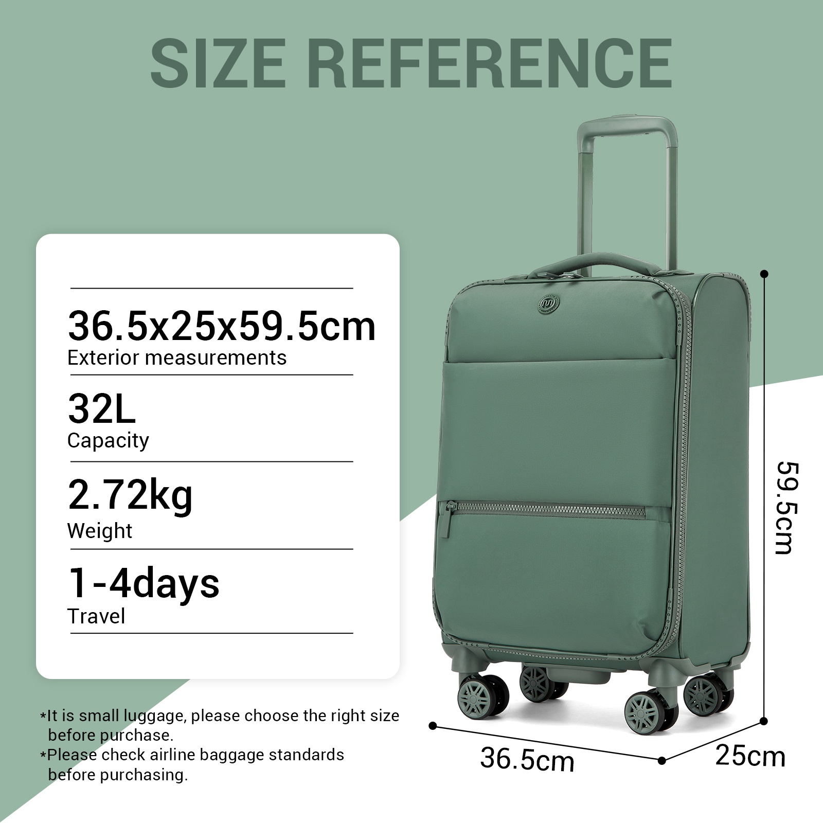 20 inch - 59.5cm (H) * 36.5cm (W) * 25cm (D) / 23.4″(H) * 14.4″(W) * 9.8″(D); 2.72 kg; approx. 32 L