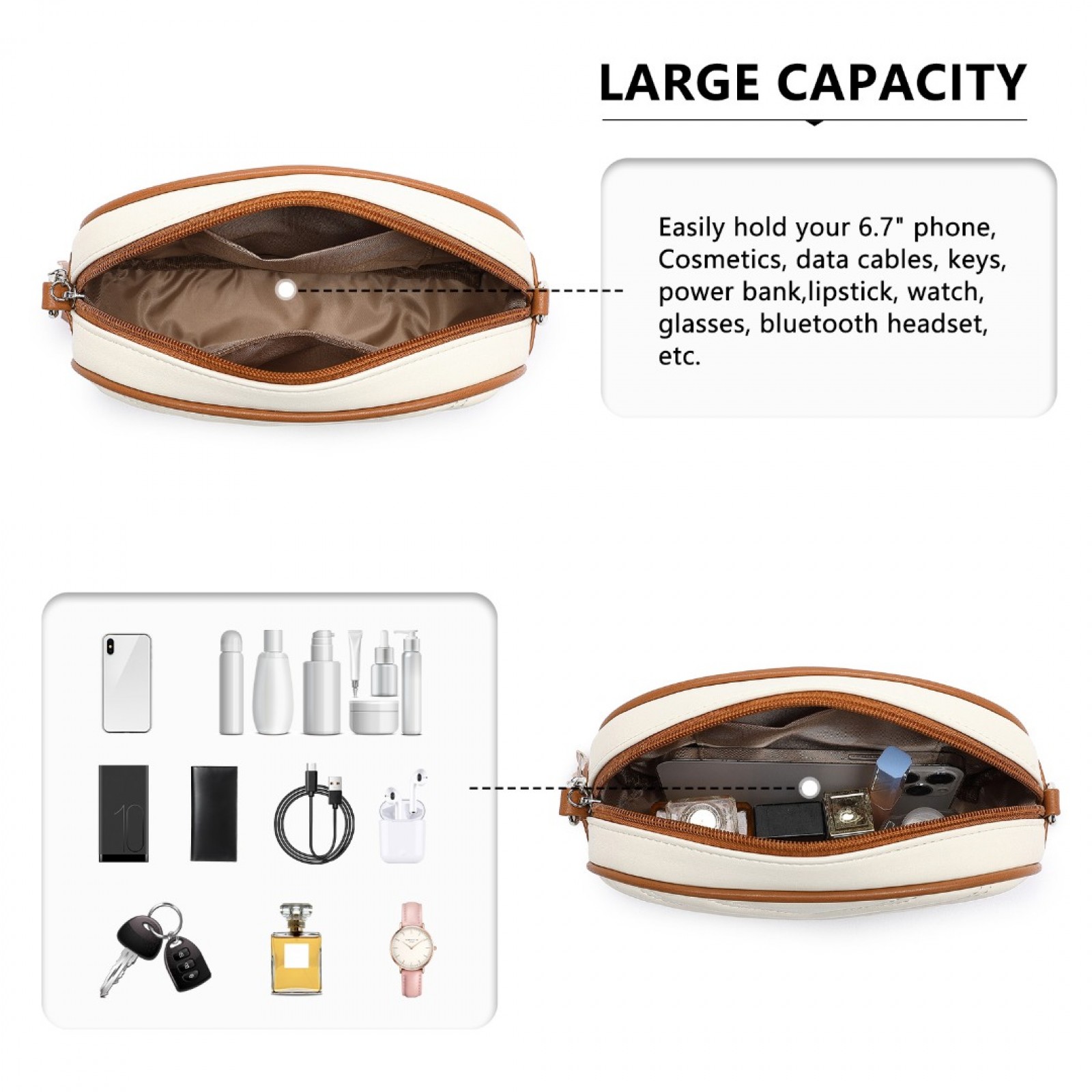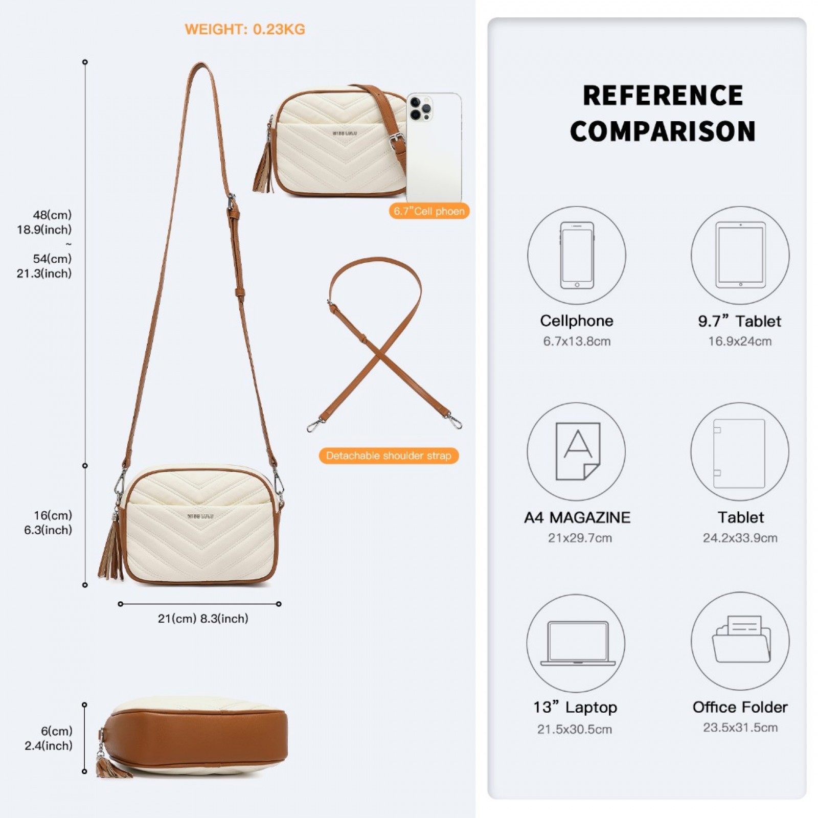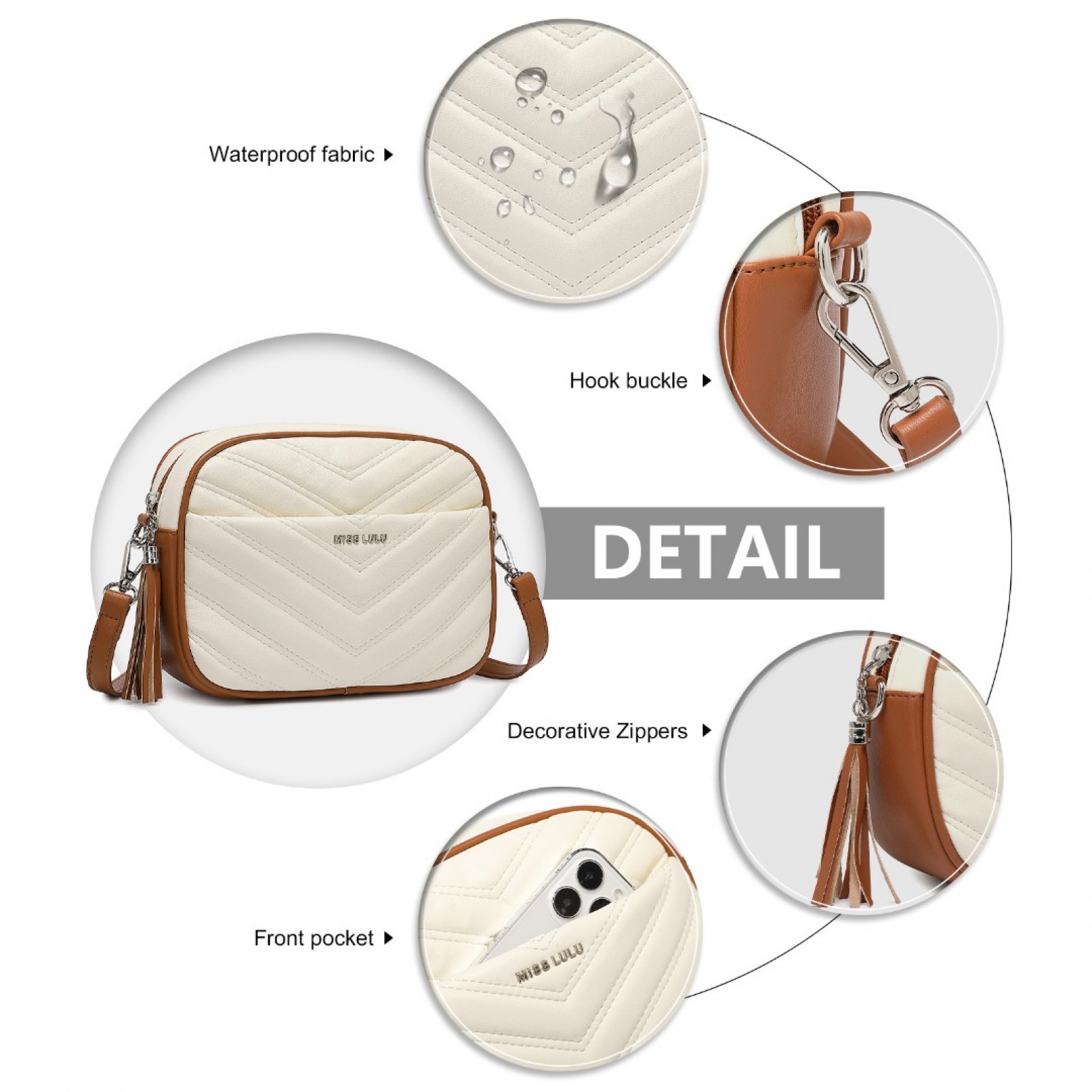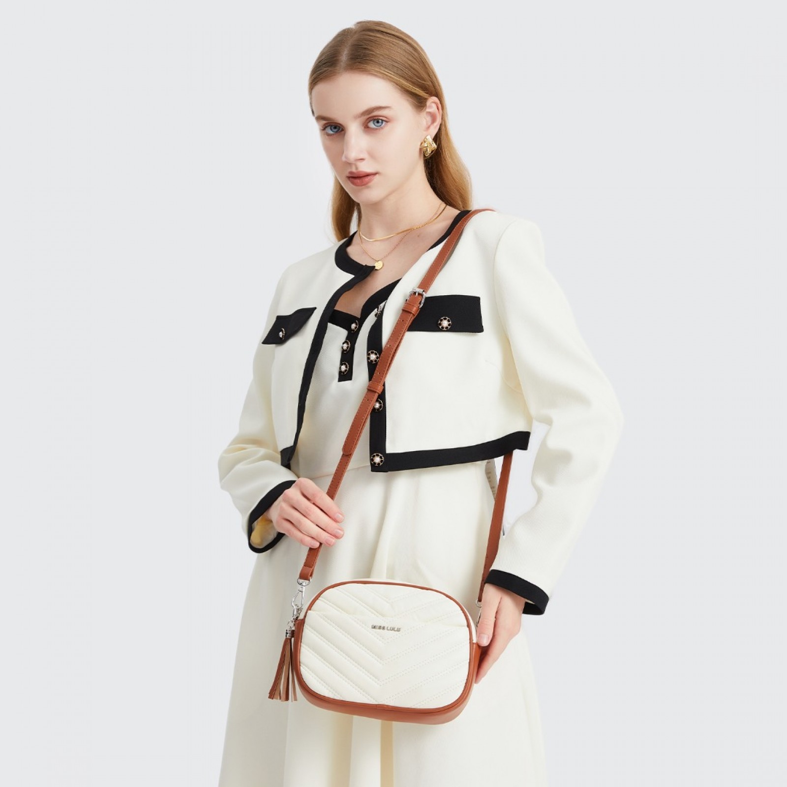 LA2119 - Miss LuLu Lightweight Quilted Leather Cross body Bag - Beige And Brown