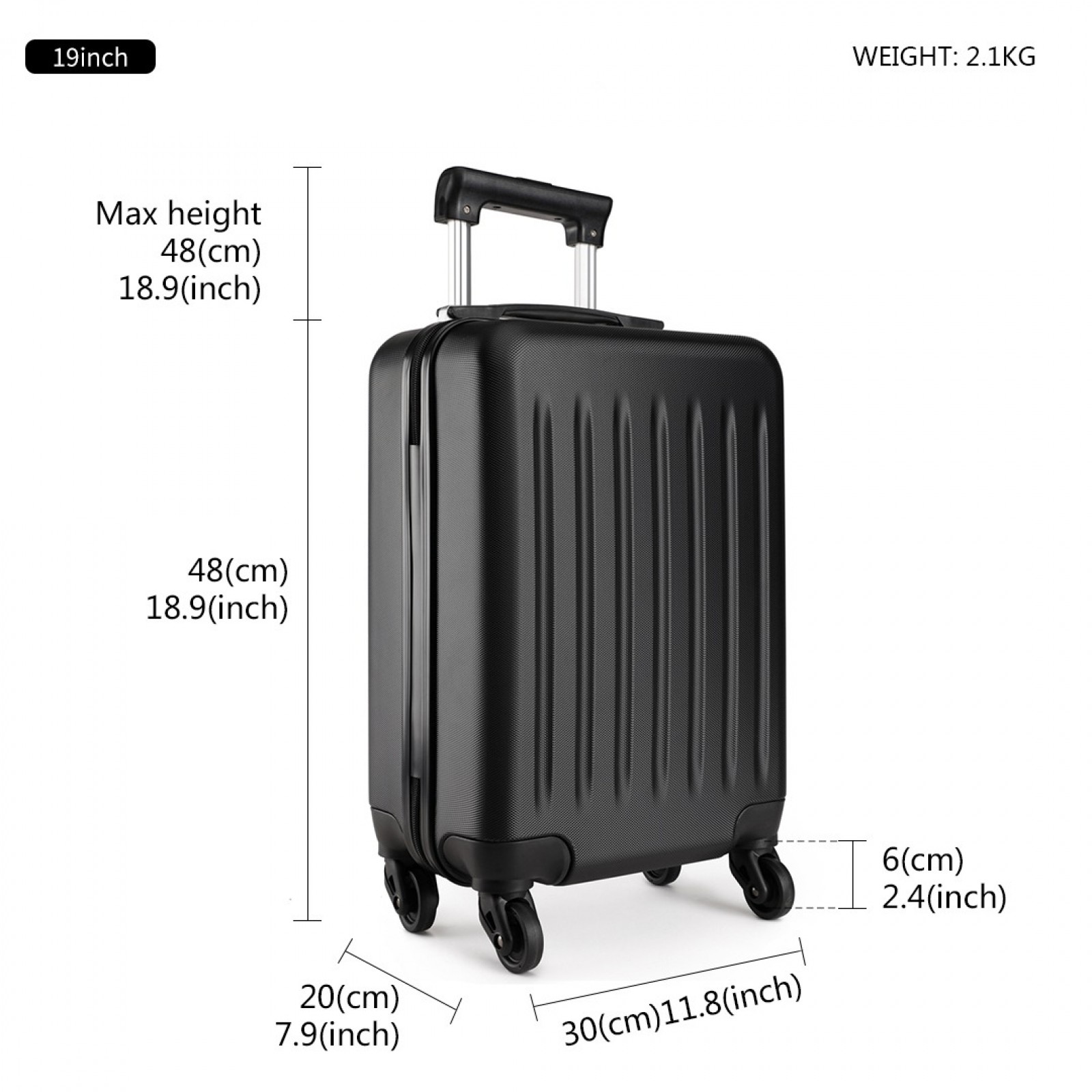 K1872L - Kono 19 Inch ABS Hard Shell Carry On Luggage 4 Wheel Spinner Suitcase - Black
