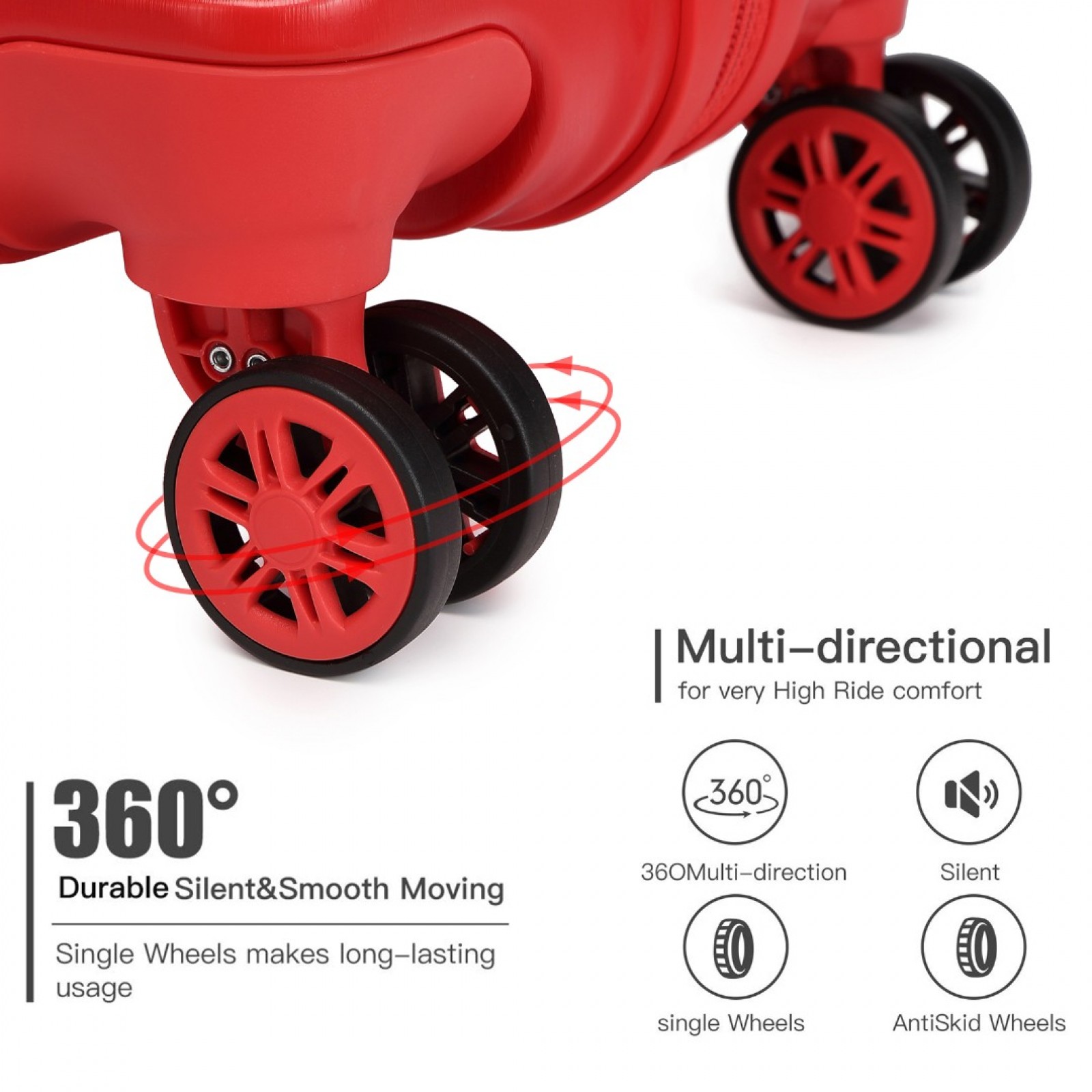 4 x 360° swivel wheels distribute the weight of your suitcase evenly and ensure easy gliding through busy airports or train stations.