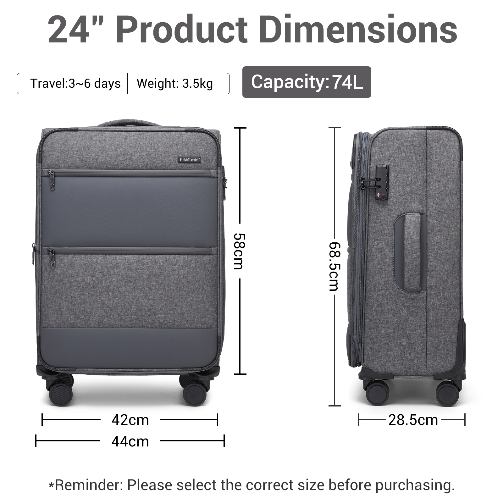 KSB2597 - British Traveller Sleek Tough 24 Inch Travel Soft-Shell Suitcase with Silent TPE Spinners, TSA Security and Expandable Capacity - Grey