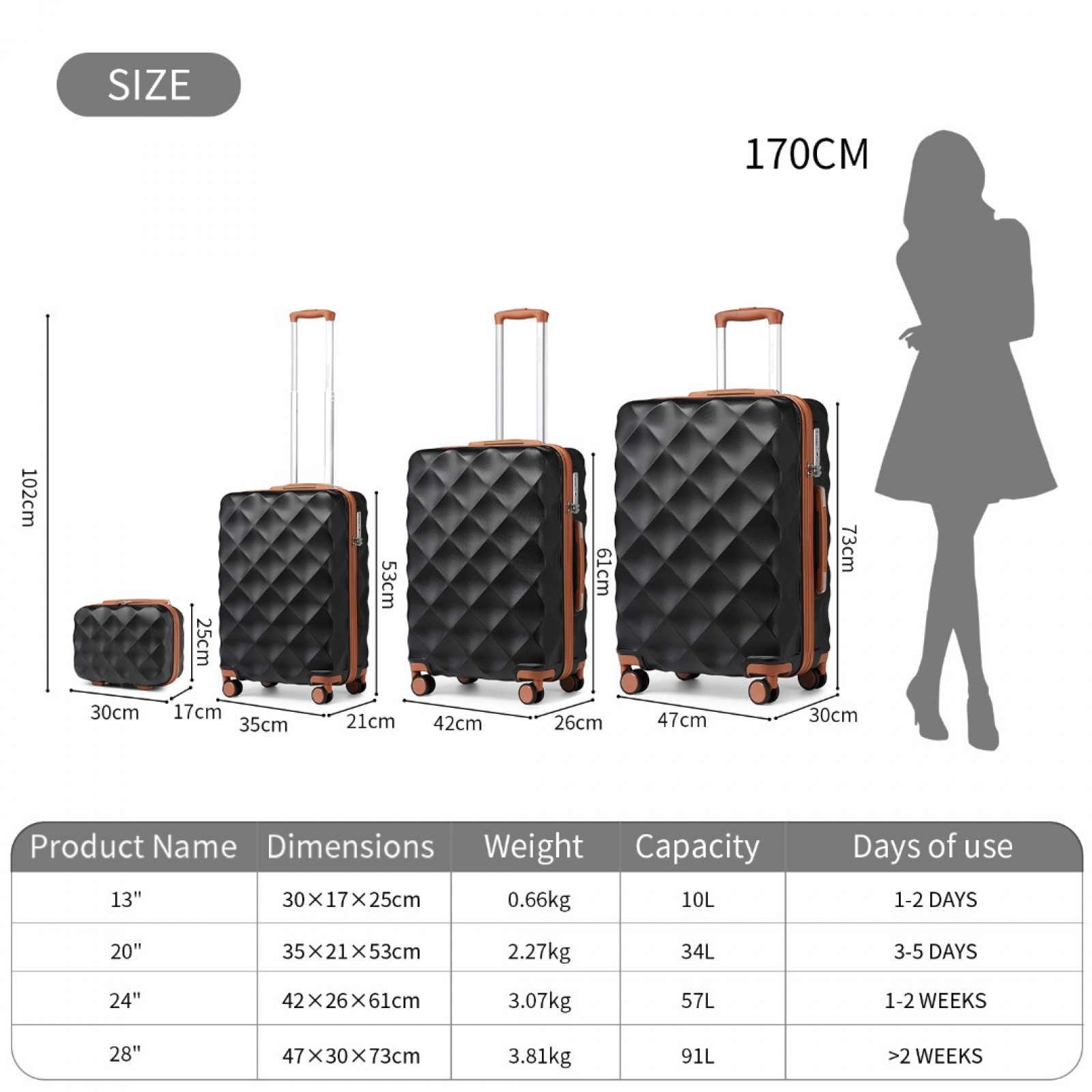 K2395L - British Traveller Ultralight ABS And Polycarbonate Bumpy Diamond 4 Pcs Luggage Set With TSA Lock - Black And Brown