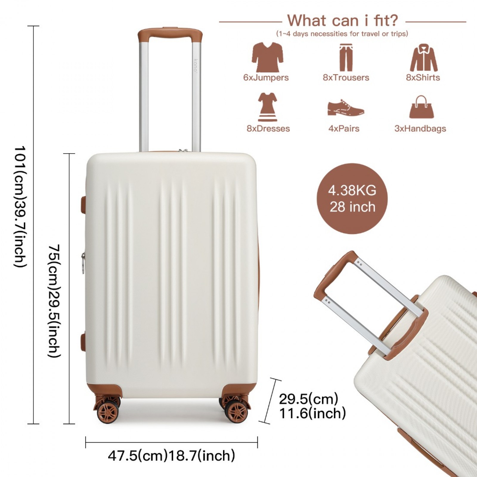 KSK2483 - Kono 28 Inch Sleek Striped Check-In Suitcase Expandable Durable ABS+PC Luggage with Four Spinner Wheels TSA Lock - Cream And Brown
