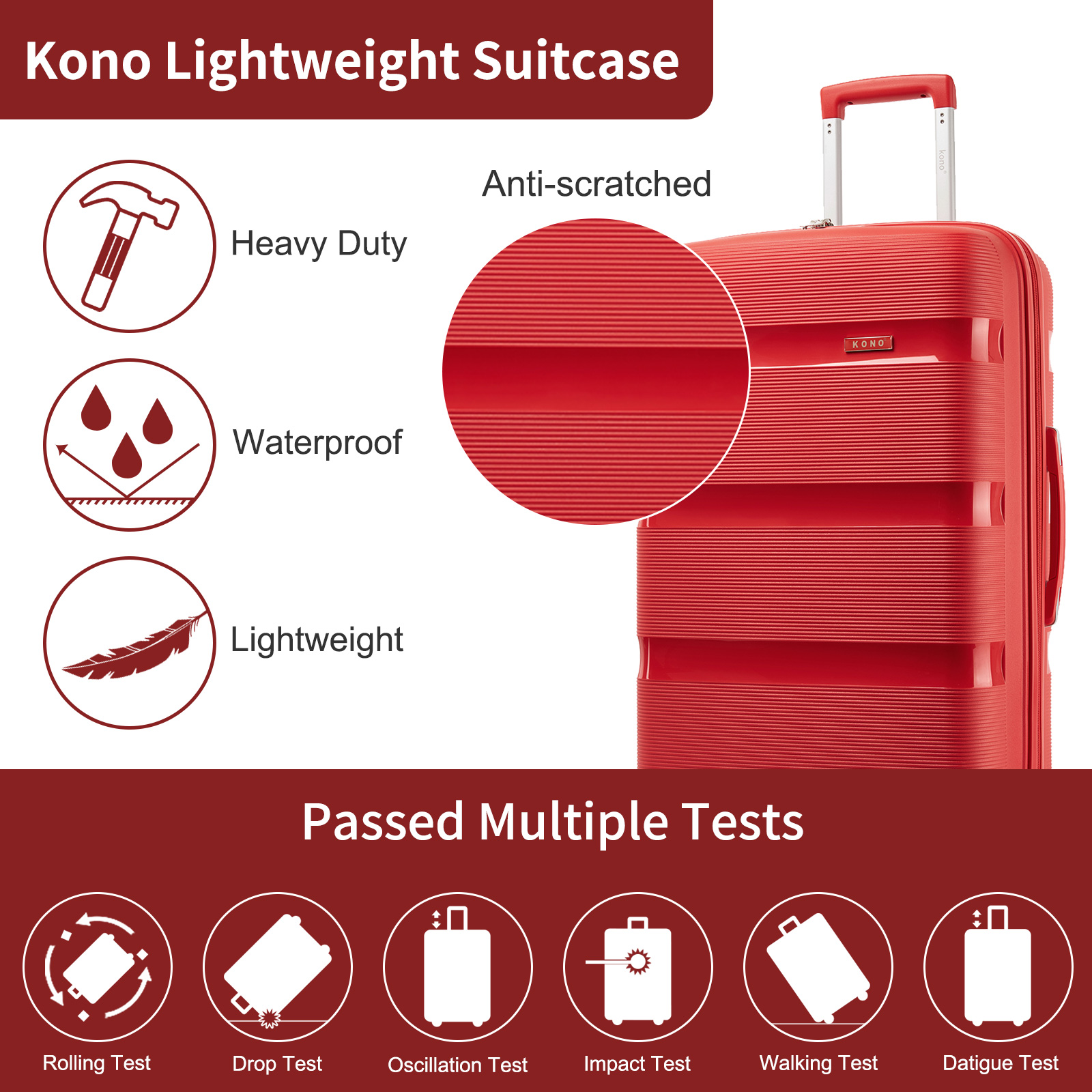 KSK2492 - Kono 19-Inch PP Hardshell Carry-On Suitcase–Lightweight Cabin Luggage with TSA Lock, 360° Silent Spinner Wheels - Red