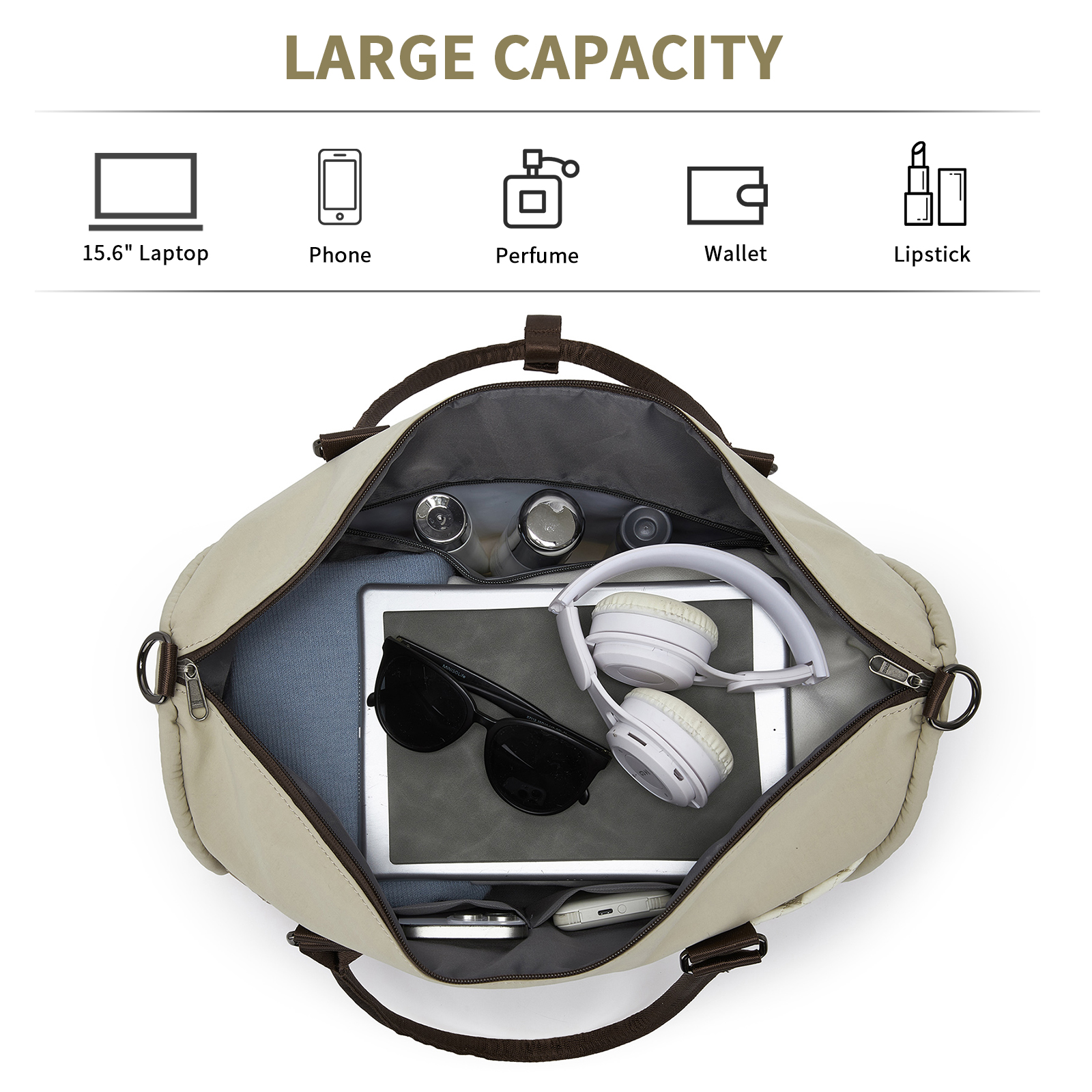 TVM2520 - Miss Lulu Stylish Quilted Color-Blocked Cabin Travel Bag with Dry-wet separation compartment & Trolley Sleeve - Khaki and Beige