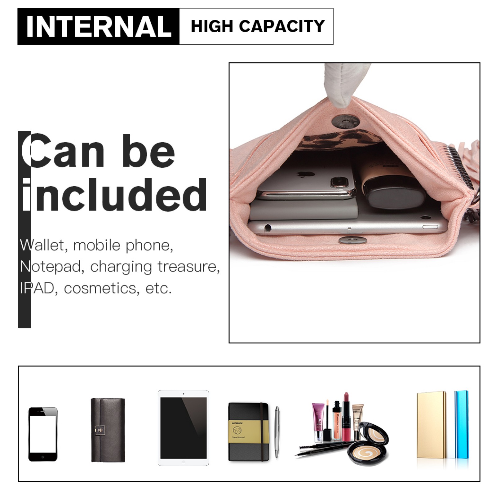 Main compartment contain a zipper pocket, is ideal for your phone, purse, keys, makeups and mobile power