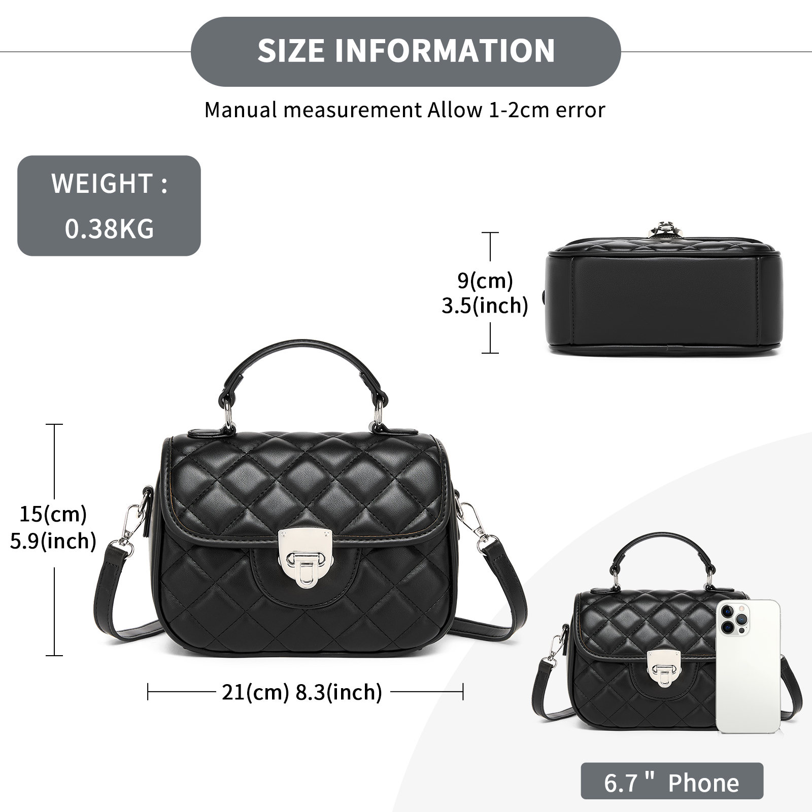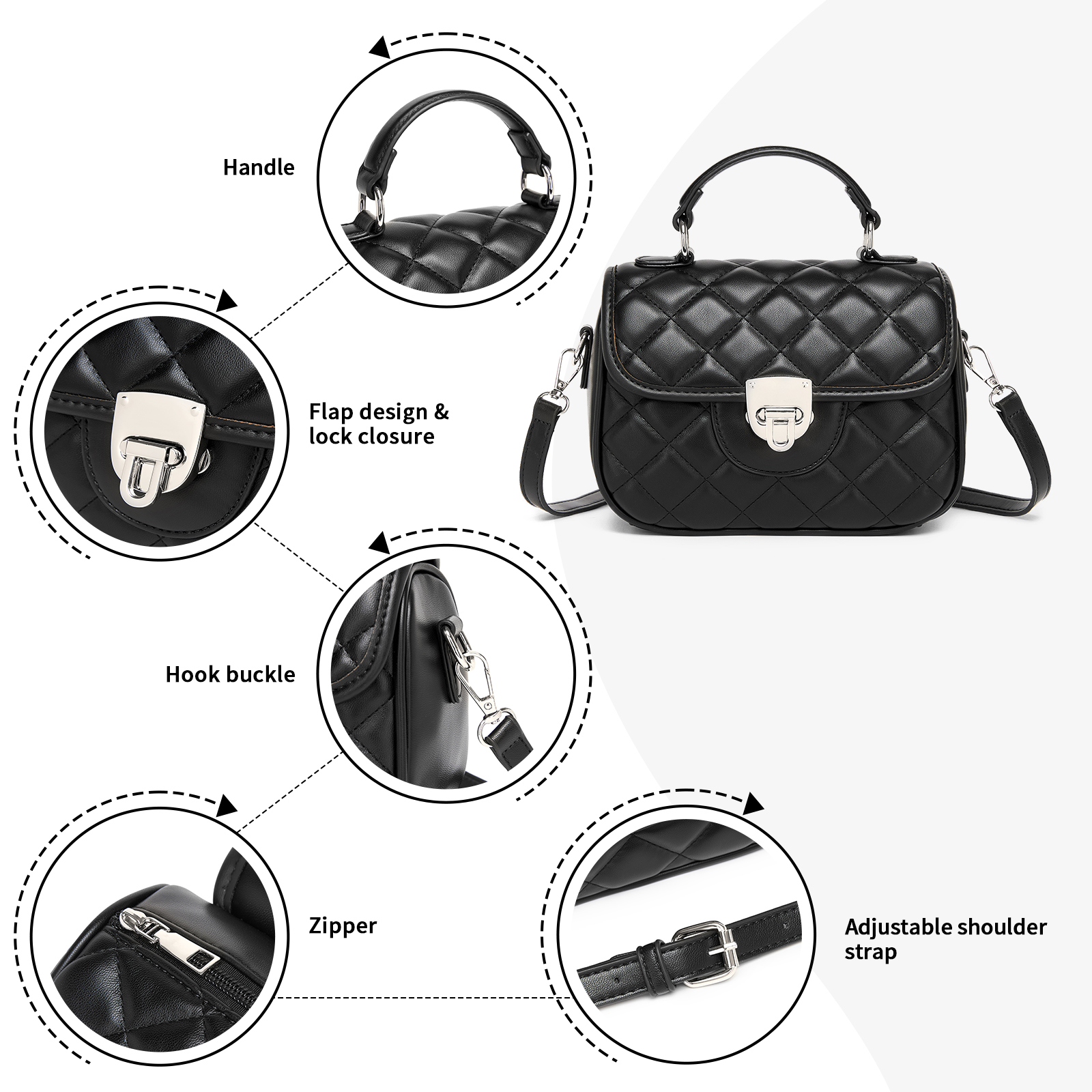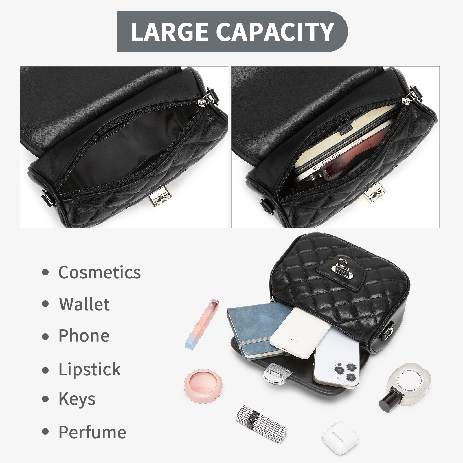 MSM2507 - Miss Lulu Practical Quilted PU Leather Crossbody Handbag with Secure Lock and Everyday Storage - Black