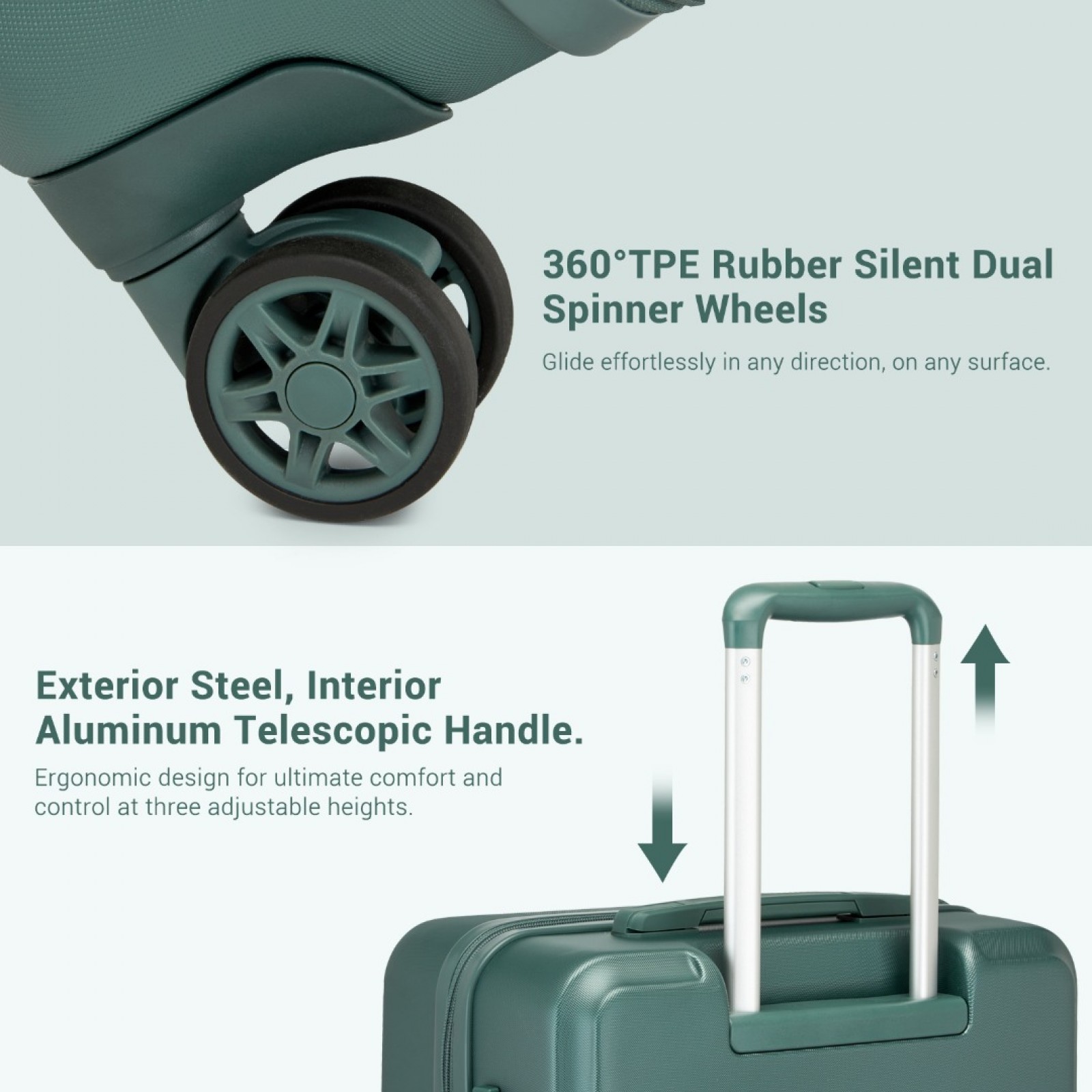 Equipped with four TPE silent spinner wheels, it offers smooth 360-degree rotation for seamless navigation through busy airports and crowded streets.