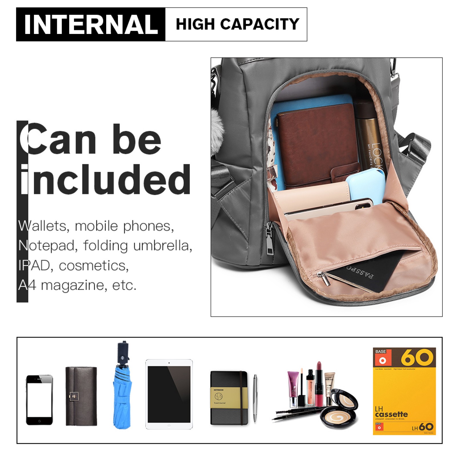 Large enough for a water bottle, folding umbrella, A4 magazines digital device (9.7" tablet, notepad, kindle, power bank) etc.