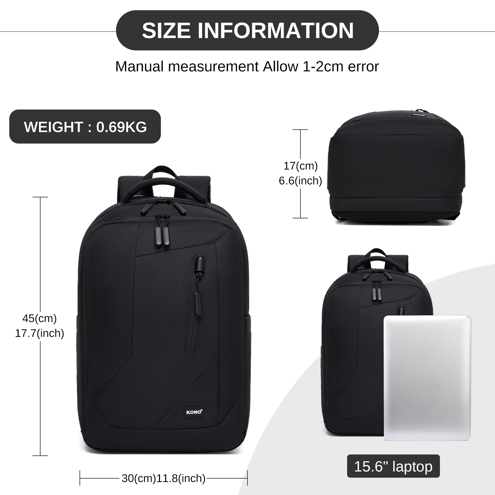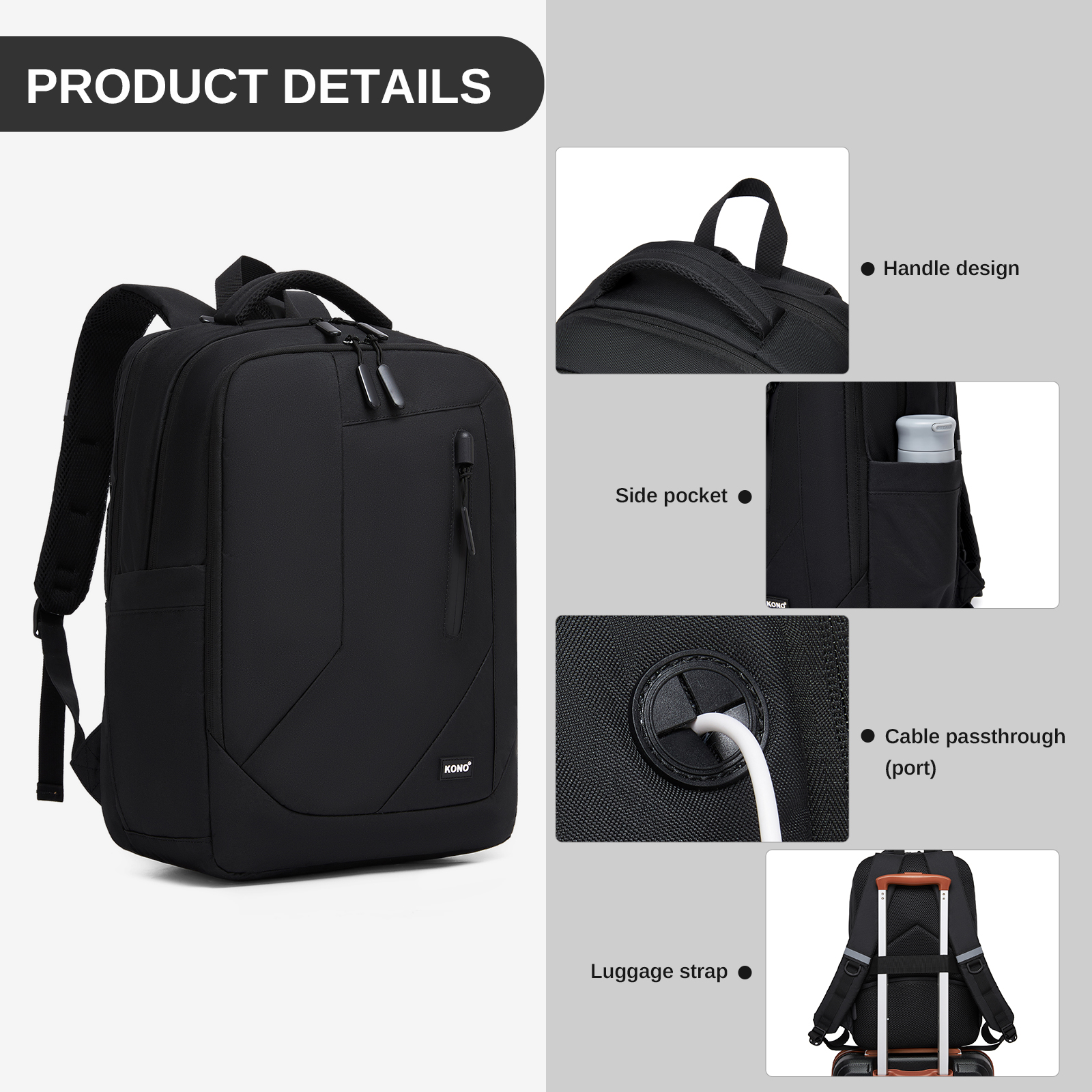 BPK2519 - Kono Laptop Backpack with 15.6" Laptop Compartment, Stylish Commuter Bag with Reflective Straps - Black