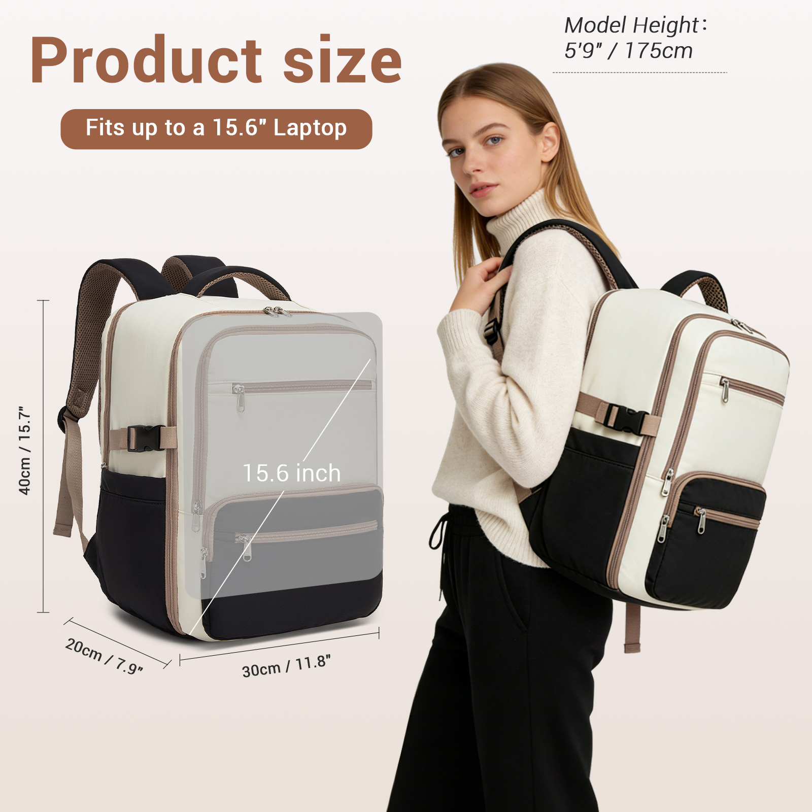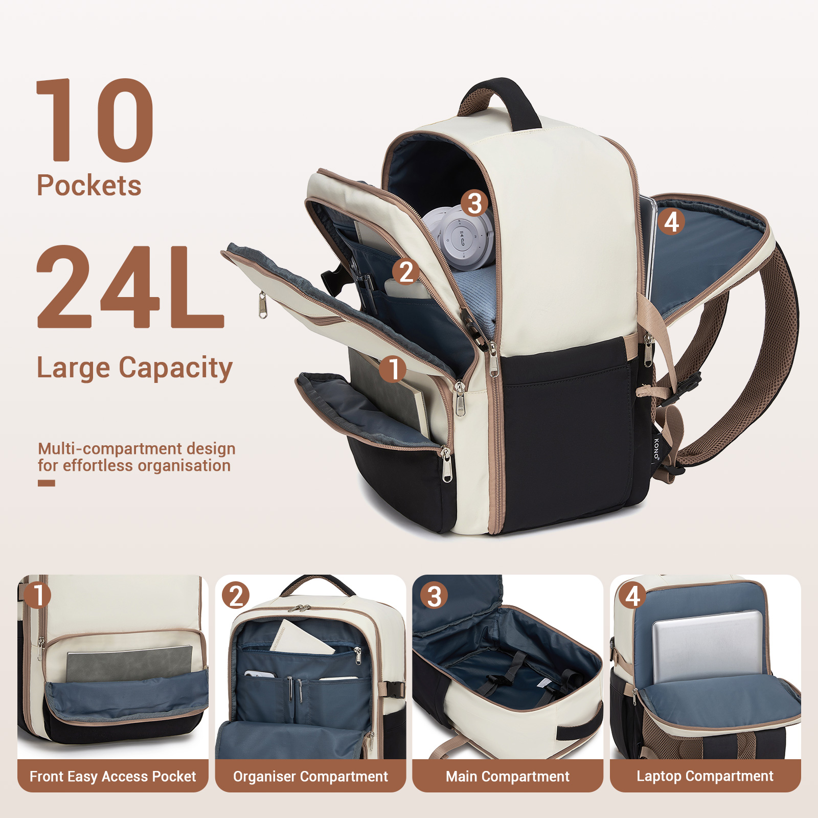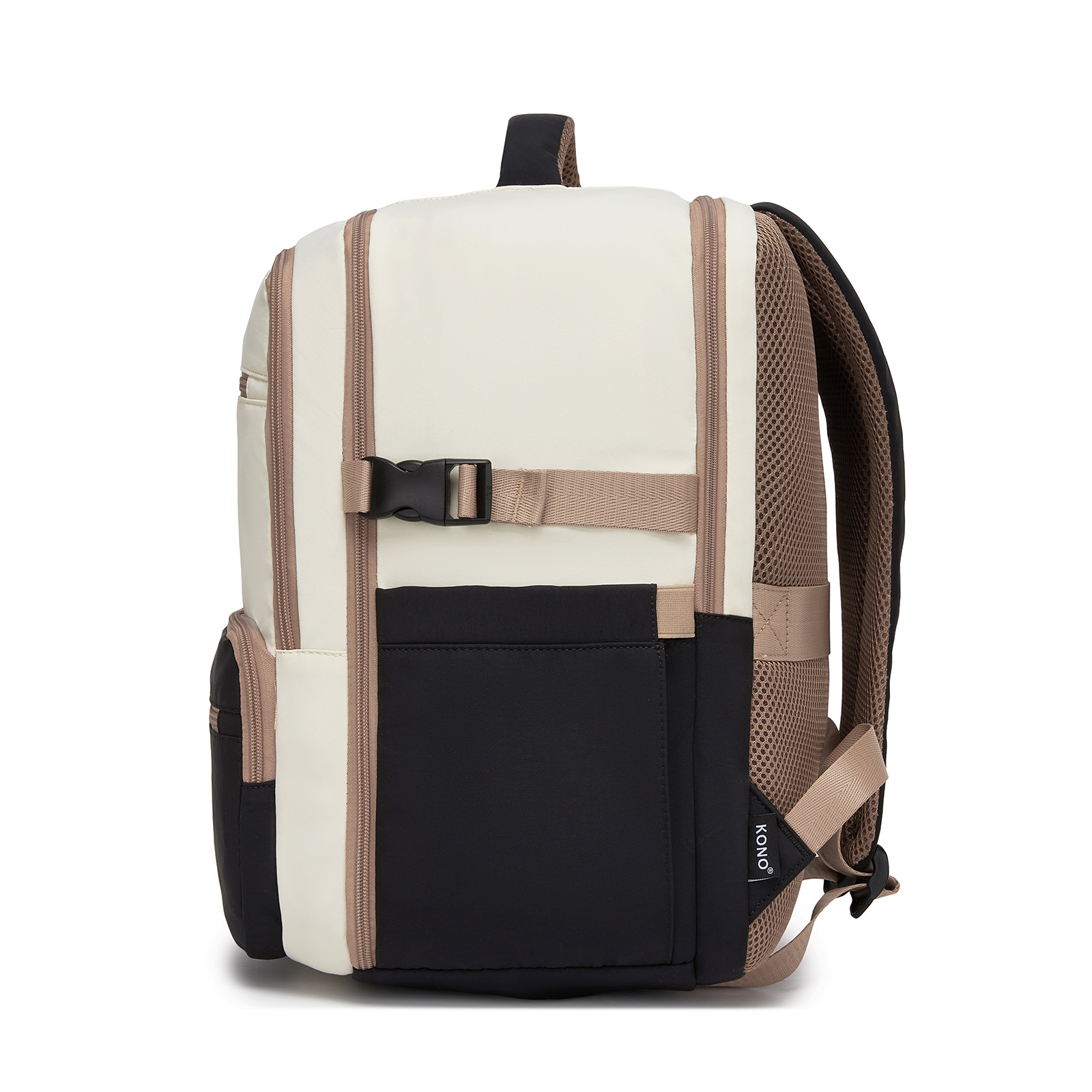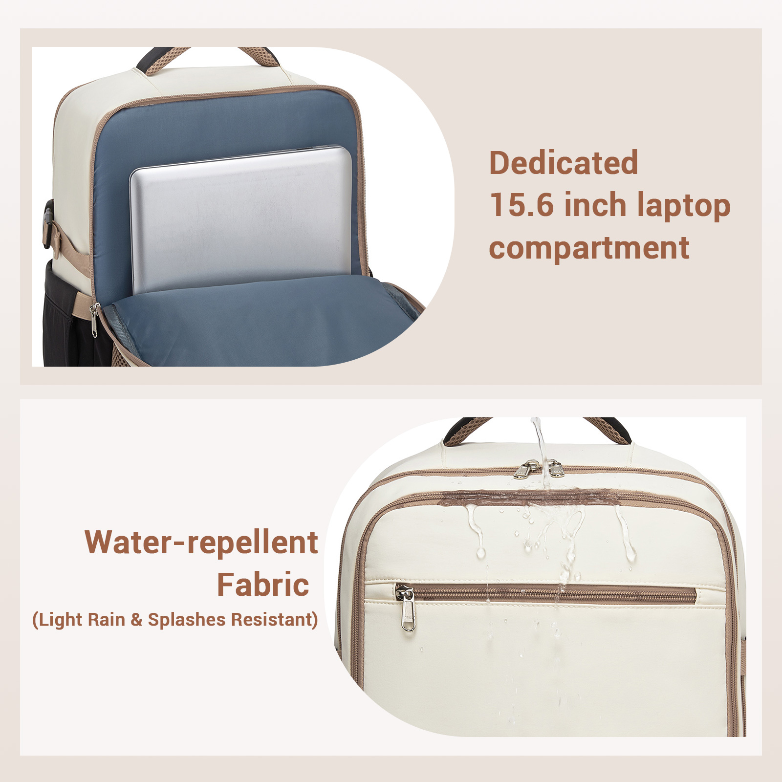 BPK2529 - Kono Compact 15.6" Laptop Travel Backpack - 40x30x20cm, Fits Under Seat Storage, with Trolley Sleeve - Beige and Black