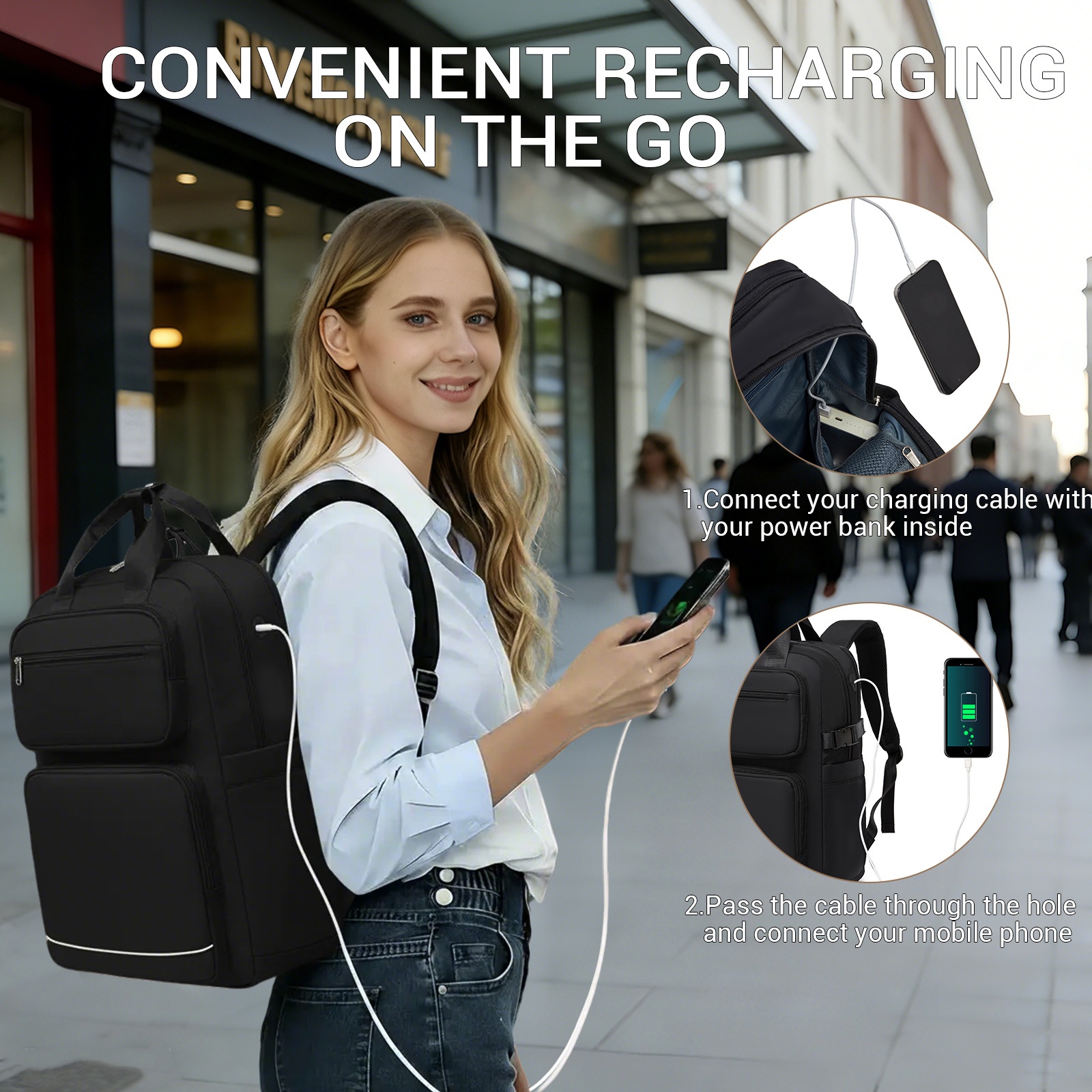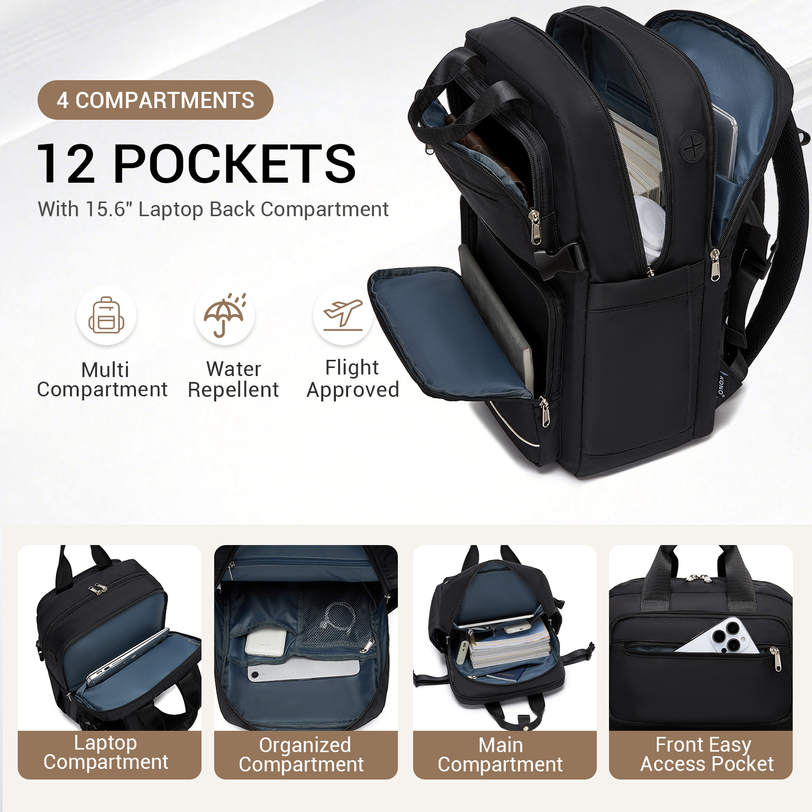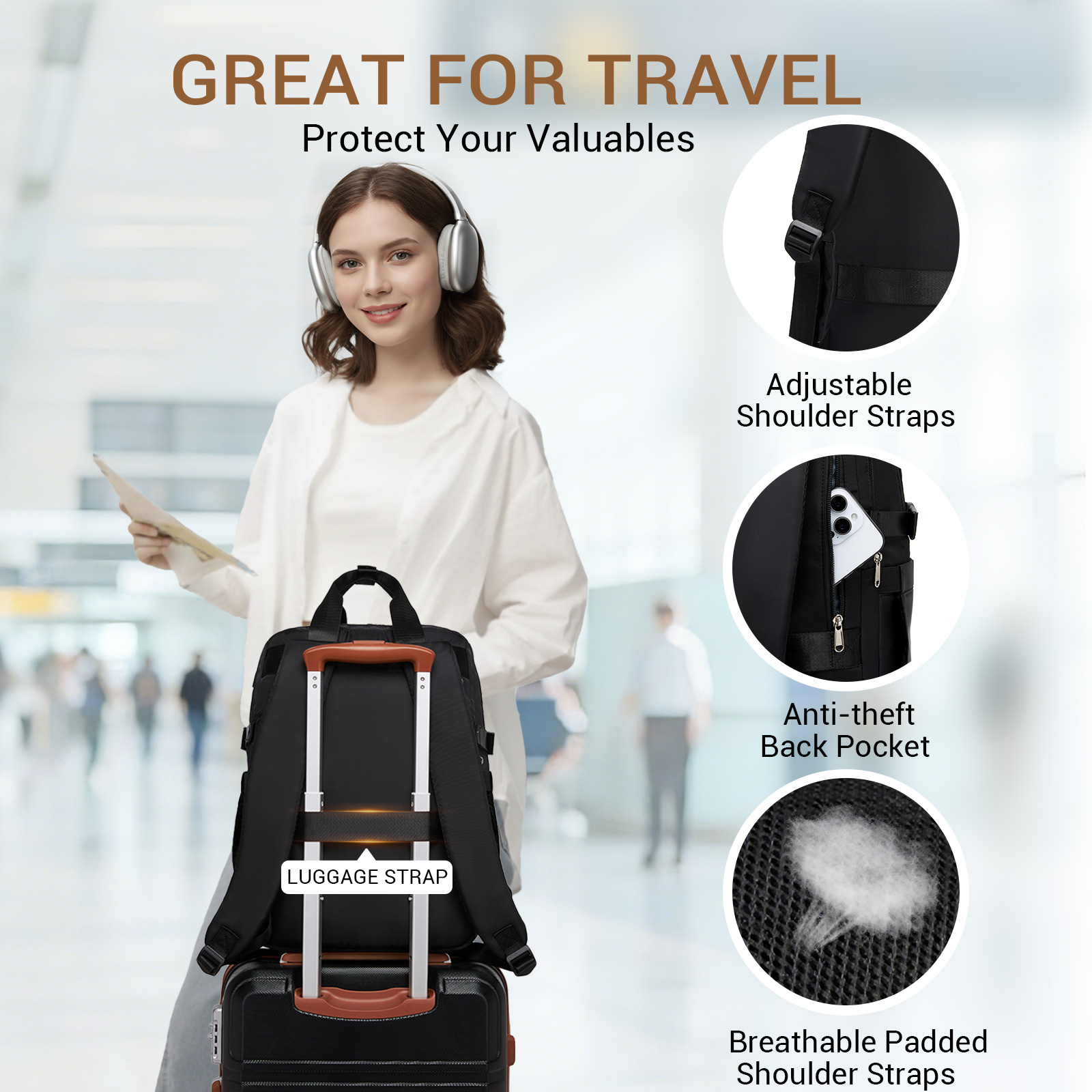 Thick padded shoulder straps and breathable back panel for all-day comfort. Top dual carry handles for easy lifting. Rear luggage strap allows you to attach the backpack to your suitcase for seamless travel.